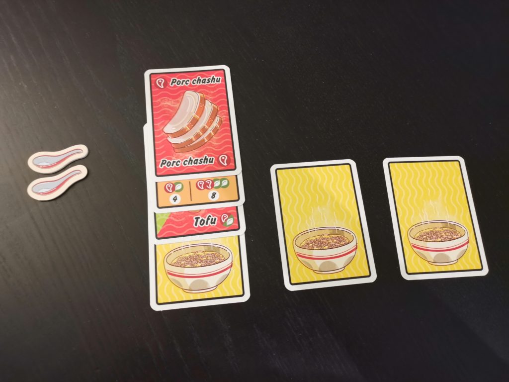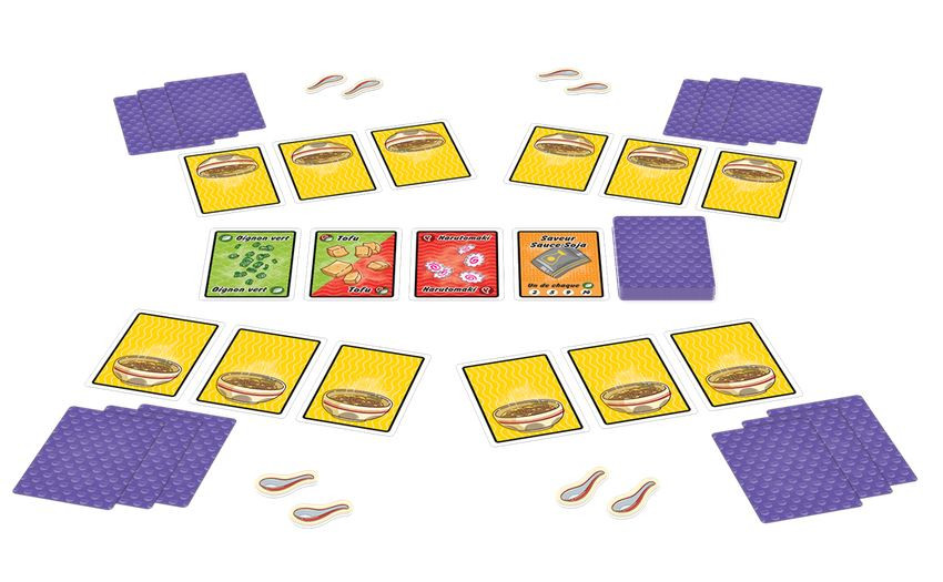 Au début de la partie, chaque joueur prend 3 cartes Bol de Ramen à placer devant lui, et 2 jetons Cuillères à sa disposition. On mélange le paquet de 89 cartes ingrédients, on en distribue 3 à chacun – que l’on garde face cachée – et on révèle les 4 premières cartes de la pioche au milieu des joueurs (ce qui constituera le garde-manger). A chaque tour, un joueur doit effectuer deux actions parmi les six disponibles :