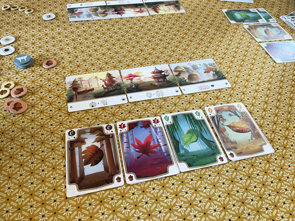 Momiji offre une expérience de jeu assez calme et réfléchie, où les premières parties sont assez déconcertantes : nous étions tellement dans un esprit zen que la pioche s’est écroulée bien plus vite que ce que nous l’avions anticipé, et nous nous sommes finalement rendu compte au fil des parties que le jeu est assez rapide et qu’il faut savoir doser son temps de récolte et son temps de dépose.