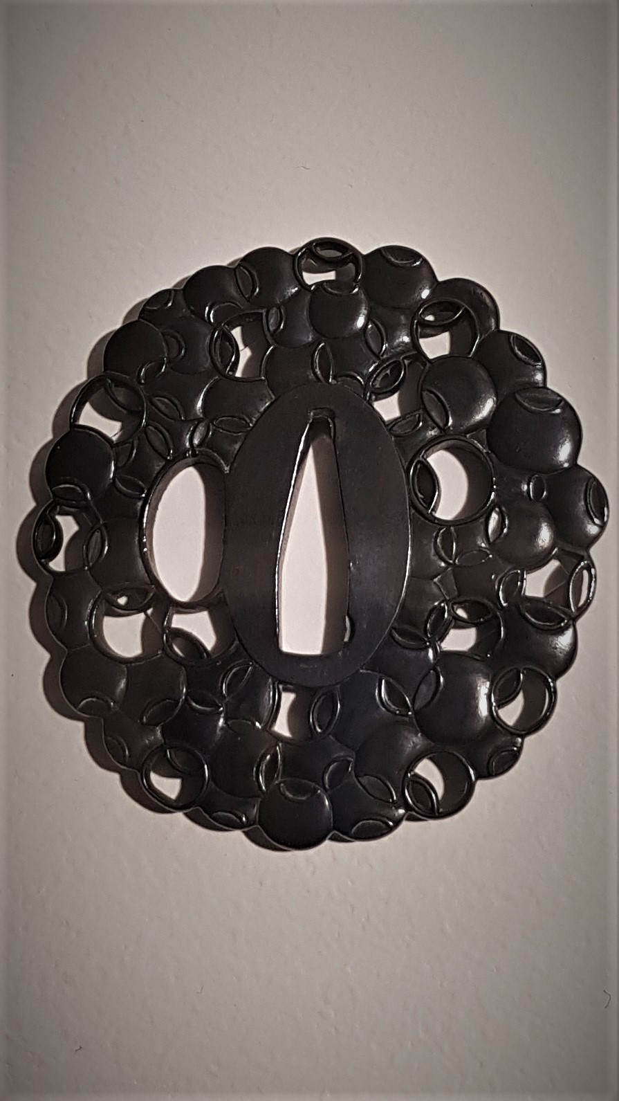 Le tsuba est de forme ronde et sert à protéger la main du guerrier contre les coups de son ennemi et aussi contre le risque de glisser sur sa propre lame.