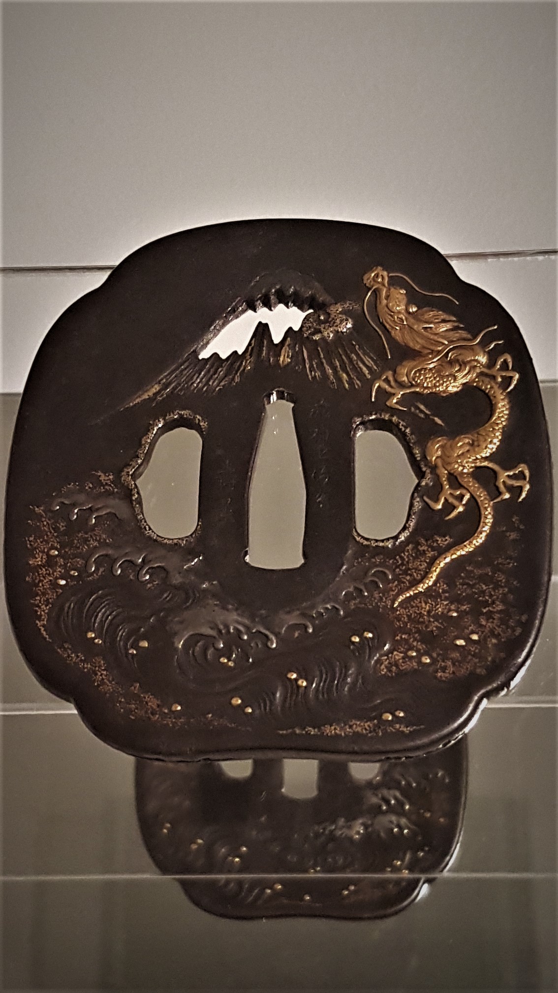 Tsuba décoré sur les deux faces. La face présentée expose le Mont Fuji vu de la mer avec un dragon. Selon la légende, voir en rêve un dragon volant au-dessus du Fuji est de bonne augure.