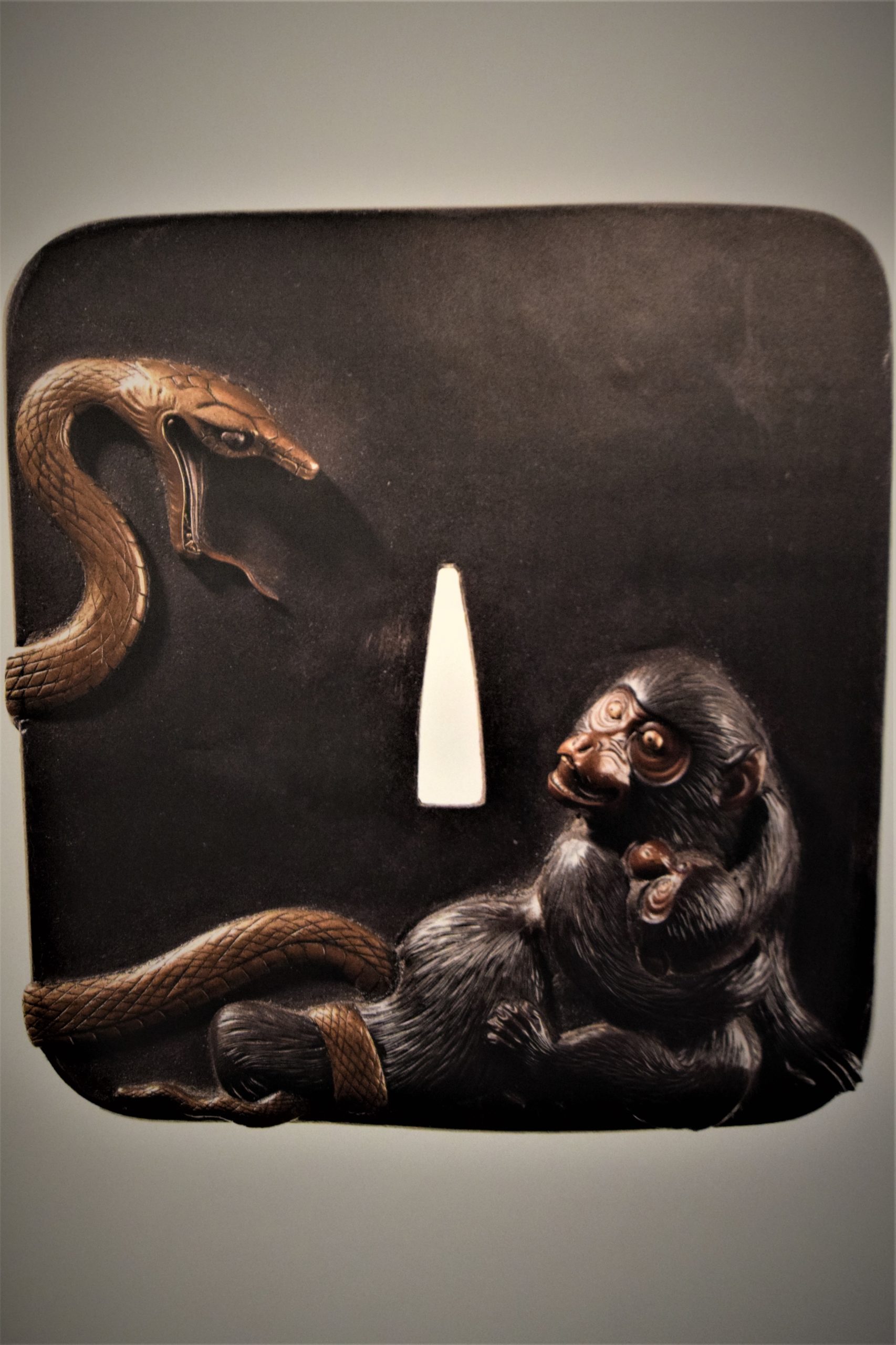 Ce tsuba est une vrai œuvre d’art en raison du dynamisme du mouvement du serpent et l’attitude d’une femelle macaque du Japon, qui protège son petit.
