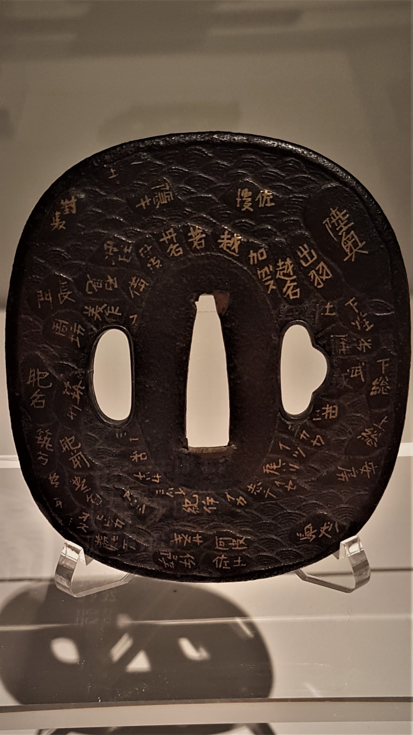 Ce tsuba est particulièrement intéressant : il présente sur son recto une carte du Japon figurant les provinces de l’époque en placage or, qui seraient aujourd’hui les îles de Kyûshû, Shikoku, Honshû et quelques îles. Hokkaido n’apparaît pas car elle n’était pas encore une province à l’époque.