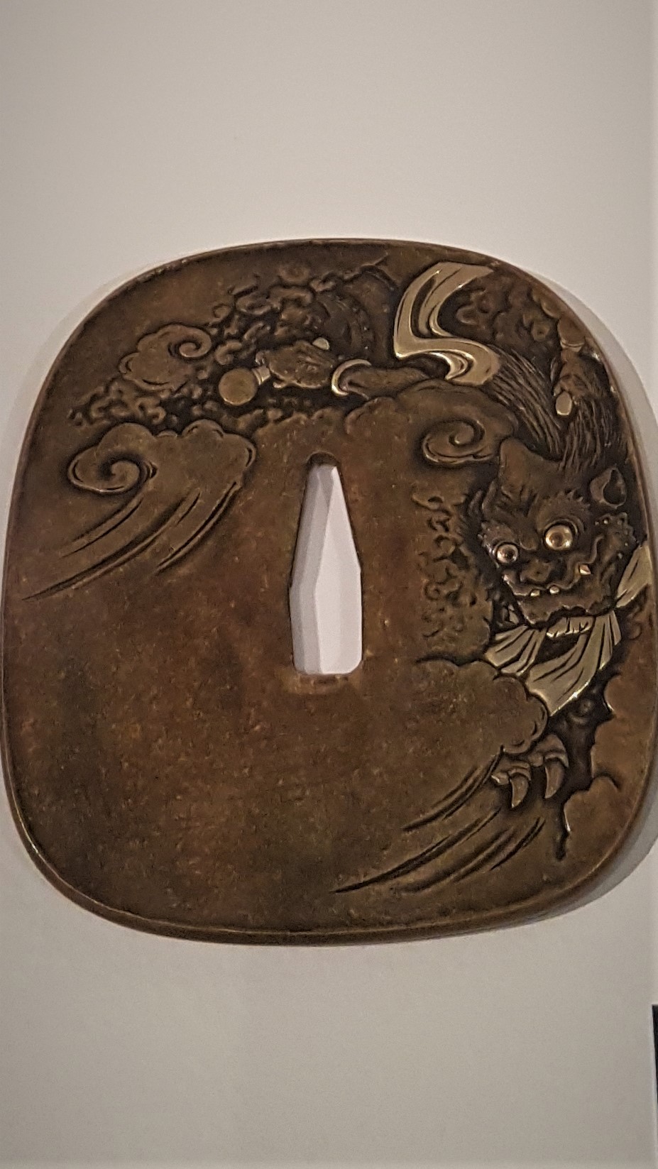 Sur le recto de cette garde de sabre figure Raiden ou Raijin, dieu du tonnerre tenant un marteau pour frapper un tambour.
