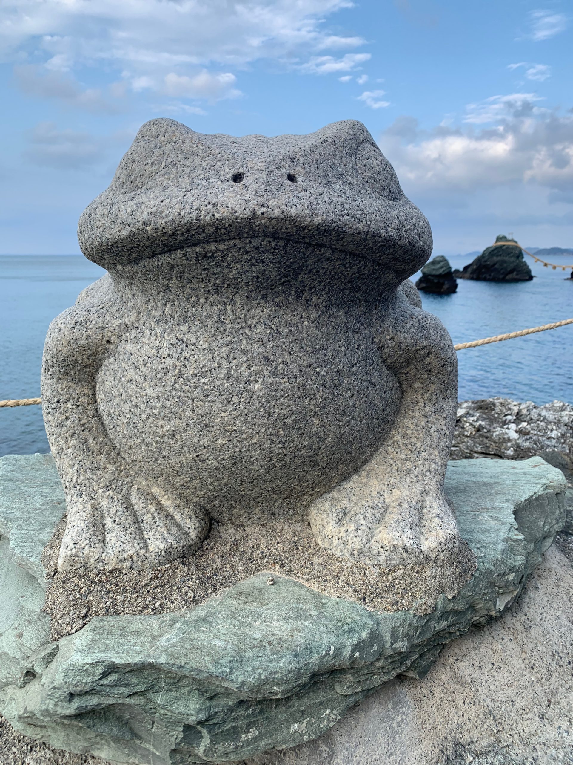 Il n’est pas rare de voir une grenouille posée sur la pelouse au bord des bassins ornementaux des jardins, à l’entrée des sanctuaires shintoïstes, au bord des temizu-ya (ou chôzuya, les pavillons d’ablution), ou en décoration d’intérieur. Le site de Meoto Iwa (les Rochers mariés), dans la préfecture de Mie, est gardé par une jolie nuée de grenouilles en pierre et en céramique. Quant à la statue de Futami Kaeru, la grenouille de Futami, elle veille sur la plage.