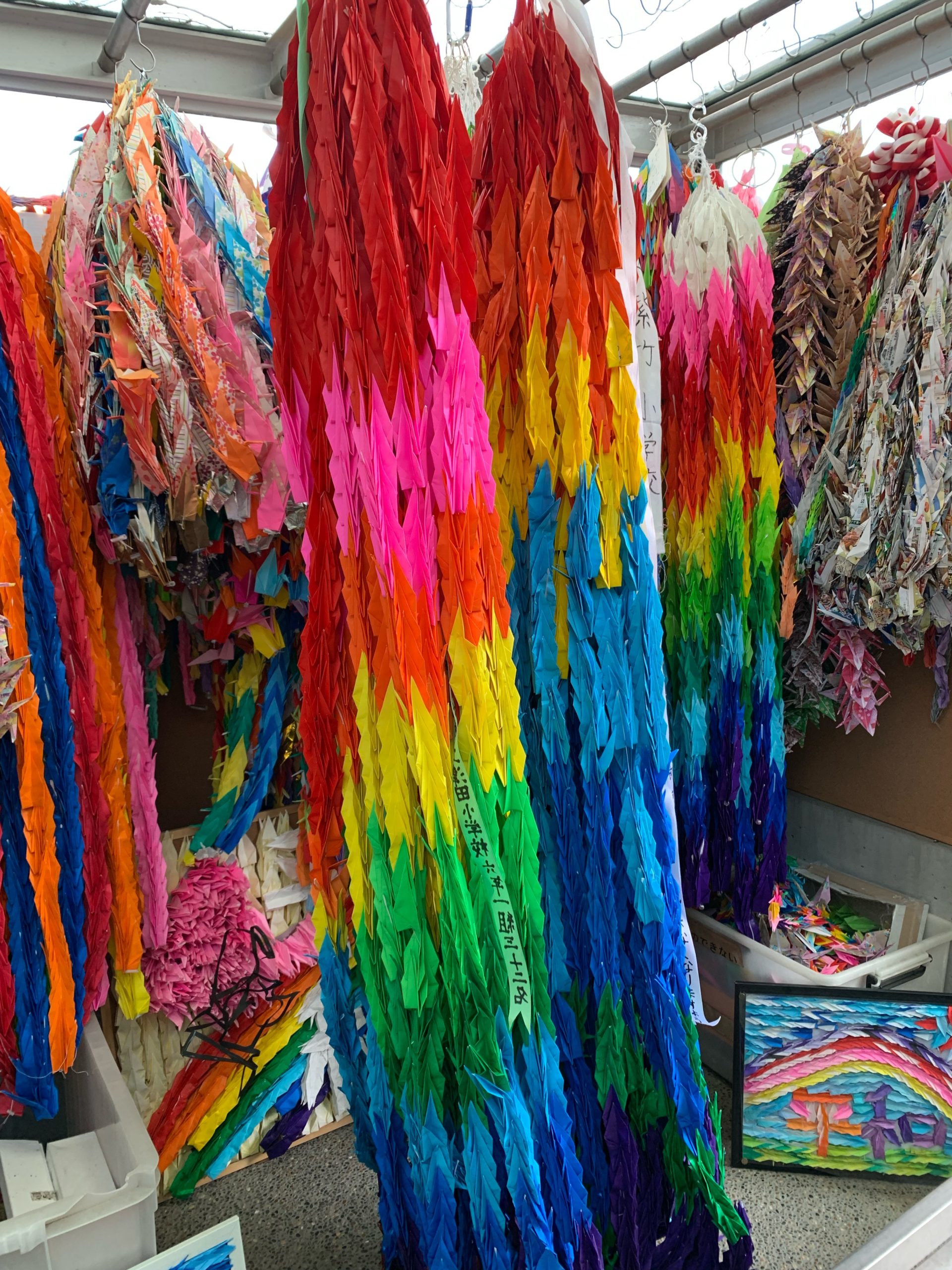 En atteignant le millier de spécimens, les petites grues en origami sont reliées entre elles en guirlandes, donnant alors naissance à une nouvelle œuvre : le senbazuru. Les origamis sont emboîtés les uns dans les autres, suivant les couleurs de l’arc-en-ciel. L’ouvrage demande patience et persévérance : là encore, c’est tout un symbole.