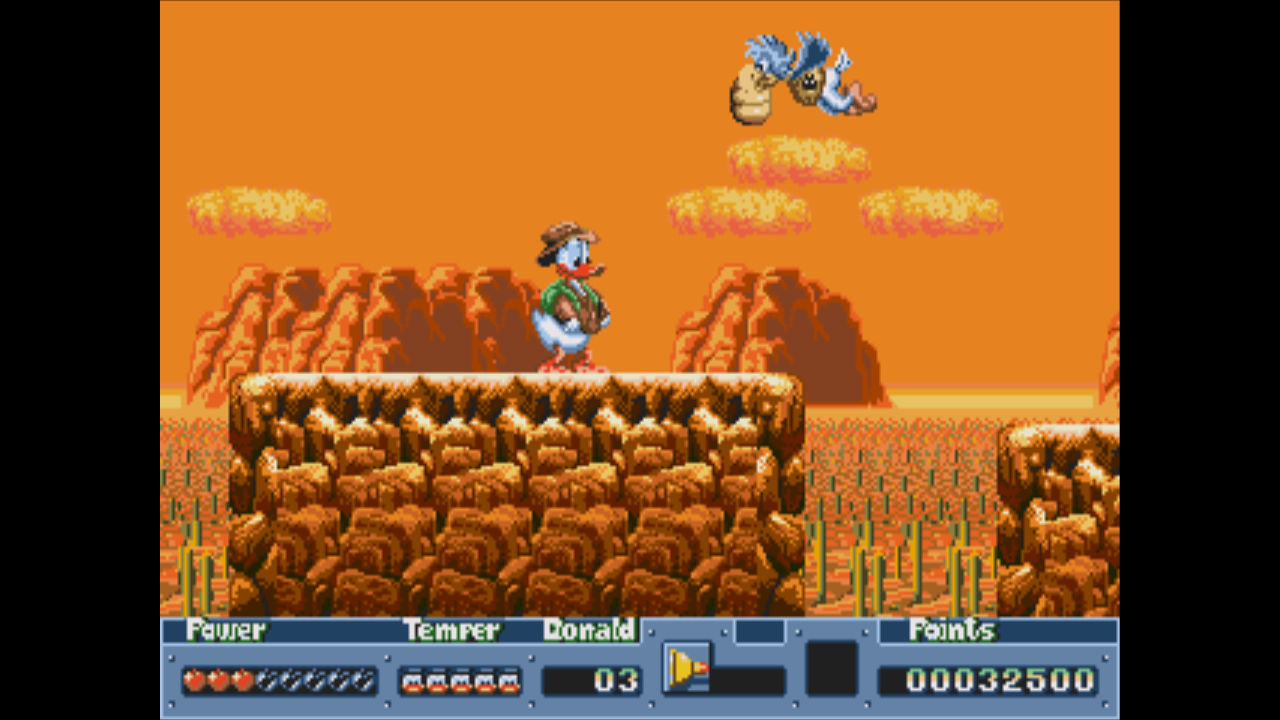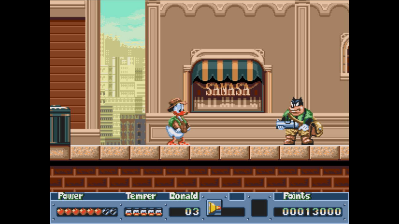 Ce troisième jeu reprend encore une fois les classiques du genre et des autres softs. On avance, on saute, on peut se baisser, des ennemis et boss nous attaquent, on peut ramper pour avancer et courir (encore une fois il faut maintenir un bouton pour, ce qui est toujours aussi étrange mais disons que c’est une marque de fabrique…). Pour se défendre, Mickey comme Donald disposent d’une arme redoutable… un tapis, qu’ils agiteront devant eux pour vaporiser leurs opposants dans l’air ! Ca a l’air un peu crade dit comme ça, mais c’est bien un jeu Disney, ne craignez rien…