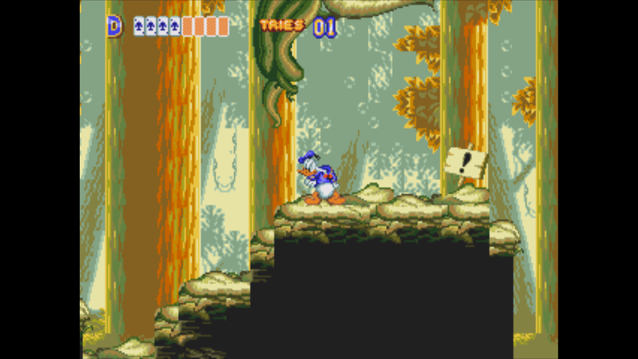 Nous sommes ici aussi dans un jeu de plateforme, mais celui-ci a quelques originalités par rapport à son ainé Castle of Illusion. Si bien sûr on avance, saute, et pour une certaine raison doit appuyer sur un bouton pour courir plus vite ici aussi, Quack Shot n’est pas un soft linéaire. Au contraire, il est composé de niveaux classiques où l’on va de gauche à droite comme dans la majorité des productions de ce genre, mais il y a le choix d’aller à différents endroits du globe à notre bon vouloir. Il est même demandé de faire des allers-retours entre les pays car l’un pourra nous bloquer si l’on ne dispose pas d’un certain objet, alors il faudra revenir ailleurs pour le découvrir, et ainsi de suite. Le jeu demande donc de l’expérimenter et de visiter chaque endroit pour savoir ce qu’il a à offrir pour pouvoir avancer dans sa quête !