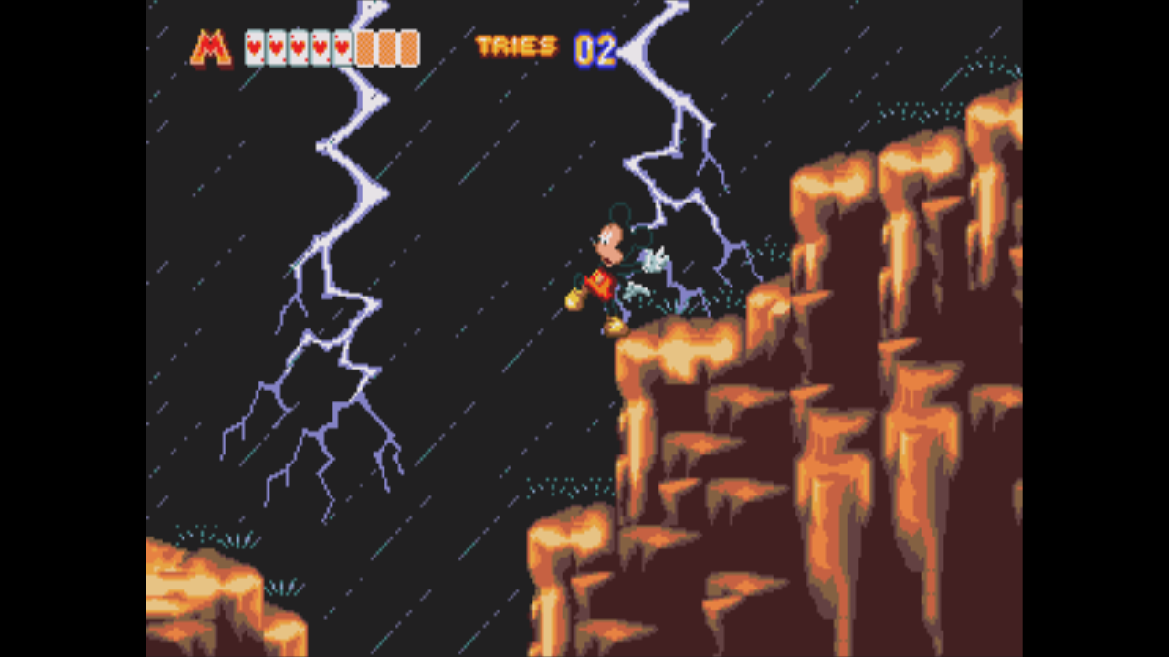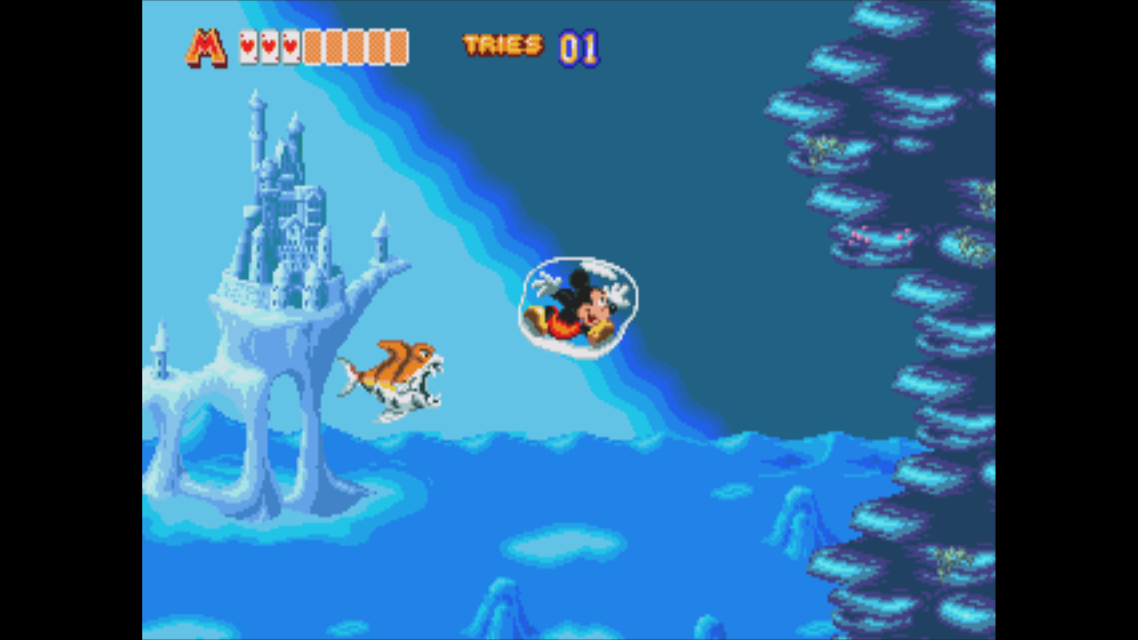 L’animation est très bonne. Bien sûr pas au niveau d’un dessin animé, mais considérant que la console avait à peine un an à la sortie du jeu, la fluidité et le nombre d’animations différentes de Mickey sont ravissants et impressionnants pour cette époque. Le personnage réagit lui aussi très bien, et on enchaîne les mouvements, sauts avec ou sans élan avec rapidité. La souris glisse un peu, comme nombre de personnages de jeux de plateformes de cette époque, mais ce n’est vraiment pas un drame. Mickey réagit très bien et n’a clairement pas à rougir de jeu du genre plus connus. Course, sauts, rebonds à foison, s’accrocher à une liane, tout se fait naturellement et facilement – on pourra juste trouver cela un peu… étrange ? Que la souris ne puisse pas sauter hors de l’eau lorsqu’on tombe dedans dans certains niveaux, tout cela pour servir le gameplay de pièges pas vraiment agréables.