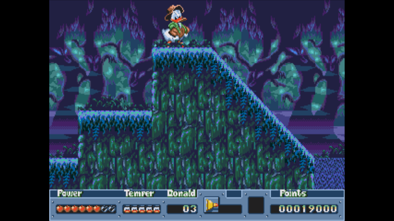 Donald peut avancer à deux vitesses, sauter bien sûr, et ramper si nécessaire. Pour se défendre, le canard pourra attaquer ses ennemis avec… une ventouse, qui les paralysera pendant un court laps de temps, permettant de passer à coté sans problème. Il récupèrera également d’autres objets au cours de sa quête (ventouses de couleurs et attributs différents) ou autres pouvant le défendre. Et quand Donald récupère un piment, il passe en mode « Quack Shot » et devient invincible pendant quelques secondes tout en éliminant tout ce qui se trouve devant lui. Quelle brute, ce canard !