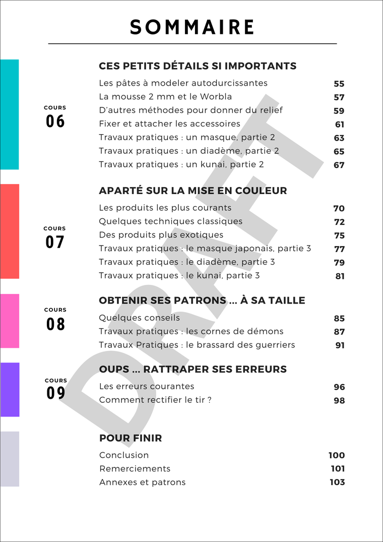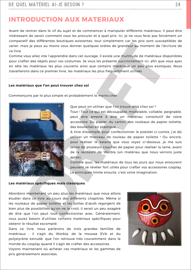 En effet, pour aller avec le livre, je propose un kit complet qui contiendra à la fois le livre et les matériaux associés au livre. Le livre contiendra donc des travaux pratiques et expériences mais également des tutoriels pour réaliser des accessoires complets. J’ai choisi les différents matériaux en fonction de ma propre expérience et de ce que l’on retrouve communément dans la communauté cosplay. Ce sont effectivement des matériaux qui sont ensuite faciles à retrouver : certains très facilement en boutiques de bricolage par exemple et d’autres où il faudra passer plutôt par des sites spécialisés dans le cosplay ou dans les loisirs créatifs (il en existe plusieurs qui sont reconnus en Europe et dont je parlerai dans le livre). Le livre contiendra d’ailleurs des informations sur le coût des matériaux et sur les possibilités pour se les procurer.