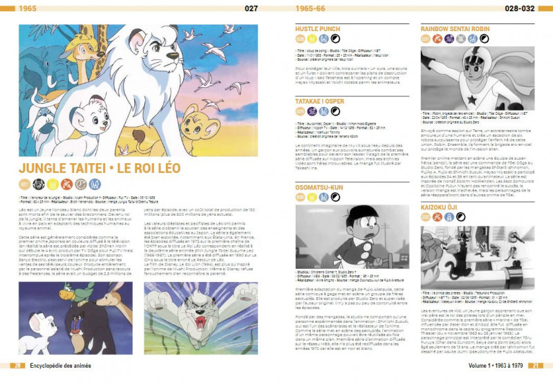 Le résumé éditeur pour le premier numéro : Le premier volume couvre la période 1963-1979. Evidemment, l’animation au Japon est née avant 1963, mais c’est une date clef pour démarrer notre collection puisqu’elle signifie l’arrivée de l’animation sur petit écran. En ce sens, notre livre Un Siècle d’animation japonaise sera un bon complément à l’introduction que vous trouverez dans ce tome 1. La collection intègre donc les séries (anime mais aussi stop-motion ou mêlant du live), les films (cinéma ou téléfilm), OAV (absent, logiquement, ce premier tome) et même métrages indépendants. Concernant ces derniers, il est difficile de tous les lister, mais vous pourrez retrouver des productions comme Daicon par exemple, ou des pilotes comme celui d’Ulysse 31 (dans le volume 2). Chaque production est traitée par une fiche (il y a 4 tailles de fiche pour ce volume 1), avec infos techniques, pictos dédiés (pour énoncer les genres), résumés et développements plus ou moins conséquents. Ces informations peuvent parler de diffusion, de production, de staff, et permettent de situer l’œuvre au Japon mais aussi en France, le cas échéant. La collection conserve généralement un regard “japonais” sur les productions. Cela signifie que Tiger Mask, Raideen, Sazae-san ou Ace wa Nerae tiennent une place importante, quand bien même la diffusion et l’importance en France furent faibles.