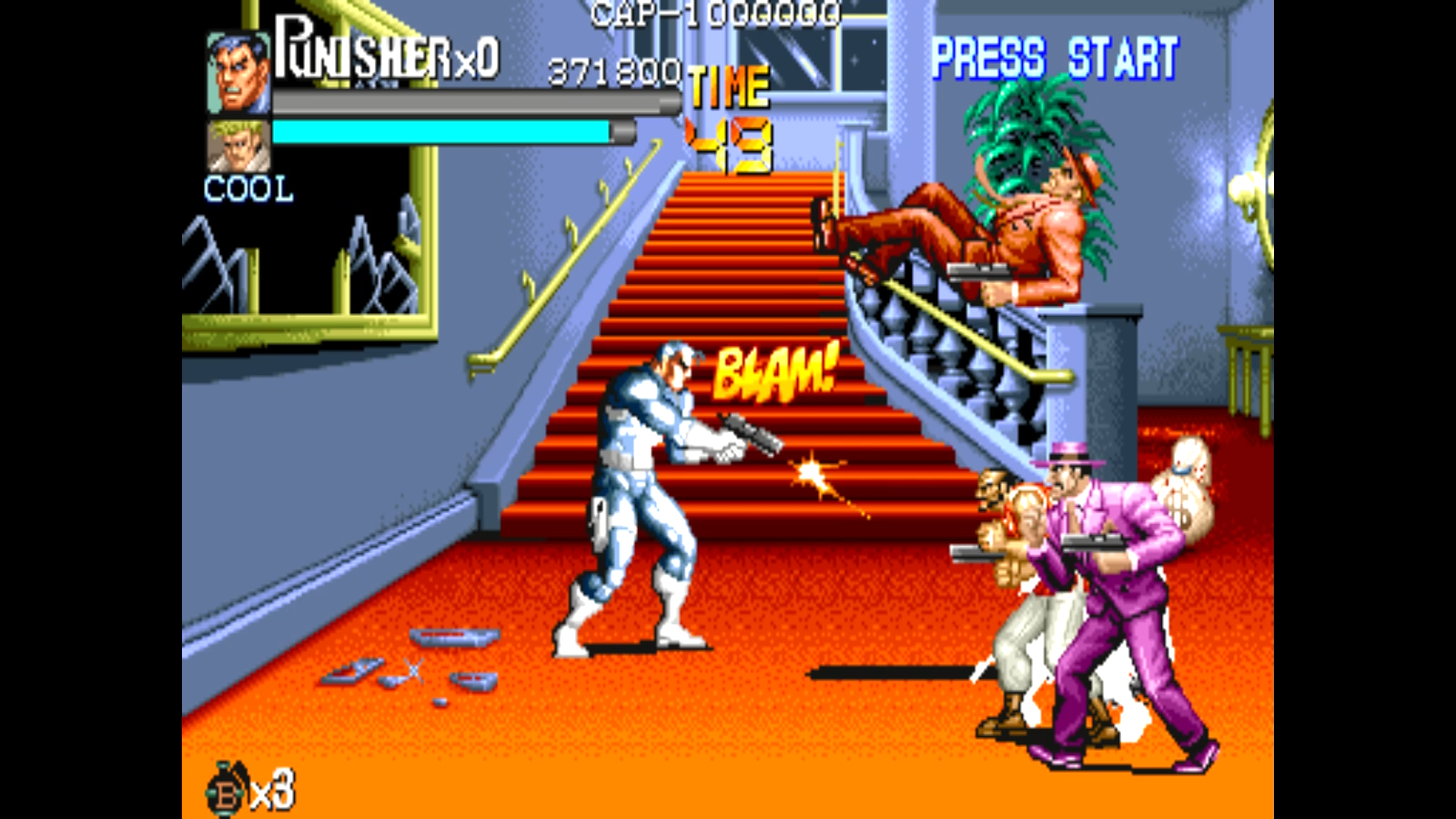 Le second soft dont nous allons parler est The Punisher, lui-même sorti sur CPS et en 1993. C’est un titre important pour Capcom en quelques sorte, puisqu’il est le premier d’une longue collaboration avec l’éditeur de comics américain Marvel, dont découlera une flopée de jeux par la suite (Marvel vs Capcom, Marvel vs Street Fighter, Marvel Super Heroes, …).