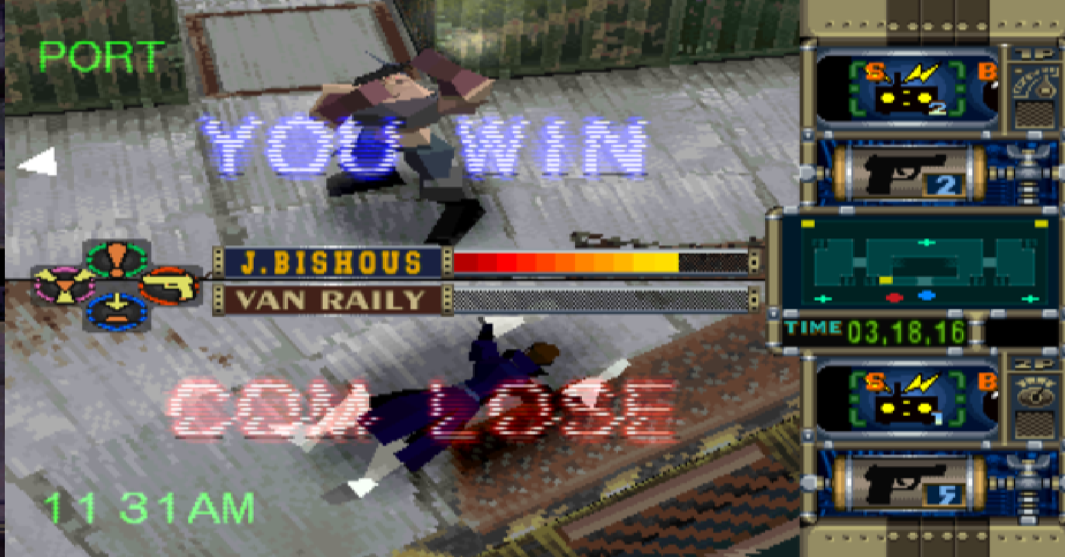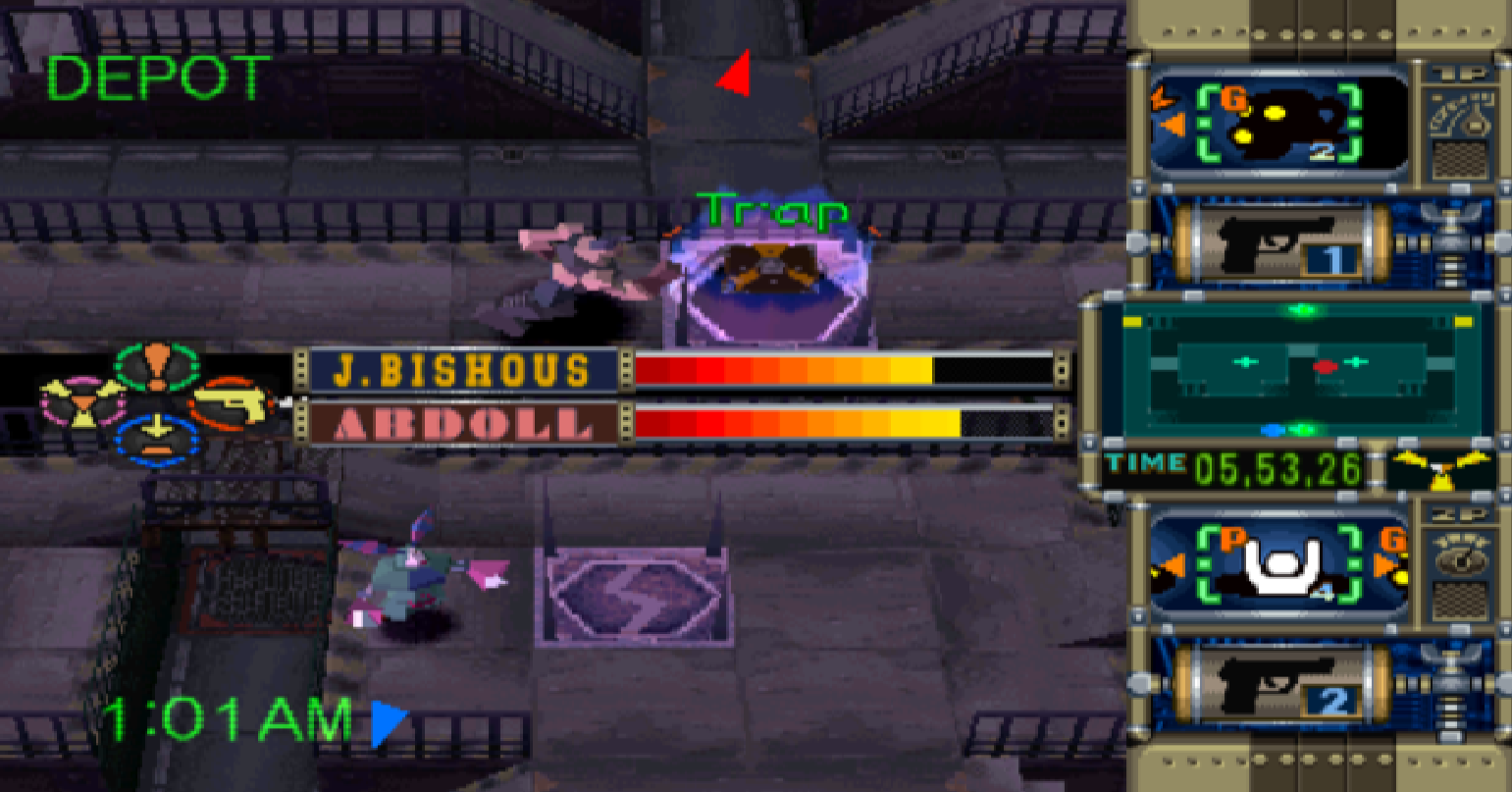 Trap Gunner est un jeu d’action-stratégie, dans lequel le but est tout simplement de traquer et tuer son adversaire dans des lieux aux topographies différentes. Pour se défendre, ils ont en leur possession, pour commencer, une arme de poing qui inflige des dégâts et stoppe leur opposant (chaque personnage a sa propre arme, Van utilise un six coups alors que John tire avec un fusil à pompe par exemple) ainsi qu’une attaque au corps à corps qui projettera leur opposant au sol – ce qui pourra être bien utile dans certaines occasions, comme nous le verrons un peu plus loin.