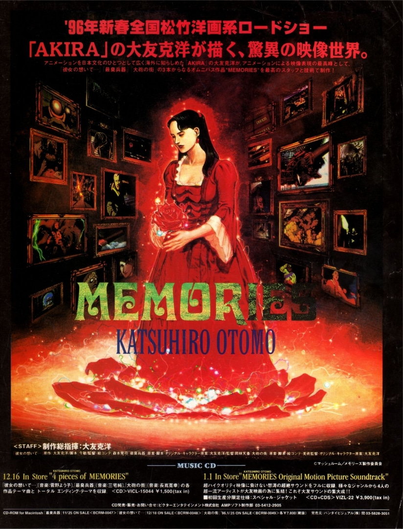 L’affiche de Memories est en effet plus démonstrative quant au rôle de OTOMO. S’il est écrit « KATSUHIRO OTOMO PRESENTS » c’es parce qu’il est impliqué, de près ou de plus ou moins loin, sur les trois moyens-métrages composant le film. Le premier, Magnetic Rose, est adapté d’une de ses histoires courtes en manga, kanojo no omoide. Il officie au character-design sur le second, Stink Bomb, et réalise le dernier, Cannon Folder. En somme, un film qui peut être qualifié de Otomo-esque bien que, nous le verrons, d’autres talents s’expriment en son sein.