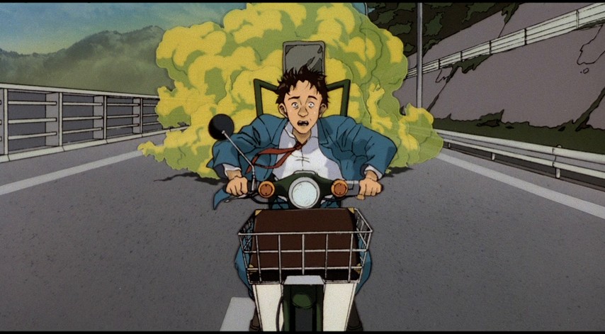 Changement d’ambiance. Après l’horreur spatiale, la crise sanitaire. Sujet tristement contemporain que Stink Bomb, littéralement bombe puante, le second segment de Memories, prend néanmoins à la rigolade. Un employé pharmaceutique un peu bébête a attrapé un gros rhume. Pour le soigner, pourquoi ne pas essayer le médicament secret du patron, rangé dans un flacon mystérieux ? Et, oui, vous l’avez deviné, c’était une mauvaise idée. Il devient une bombe humaine puante, et, à son insu, asphyxie tout être humain qui ose l’approcher. Notre héros, qui n’est pas le couteau le plus affûté du tiroir (voire de la cuisine), ne se rend bien évidemment pas compte de son état et passe tout le long du segment à chercher de l’aide, allant toujours plus loin dans le Japon qui passe alors en état d’urgence sanitaire plus que strict pour faire face aux déjà milliers de morts de l’épidémie humaine.