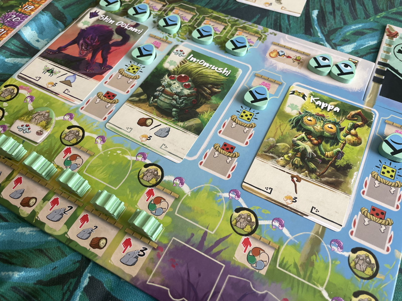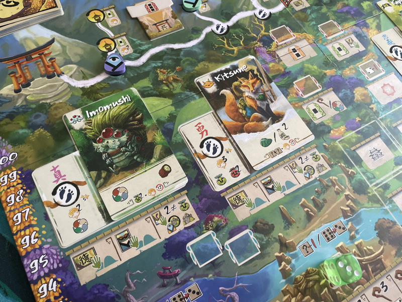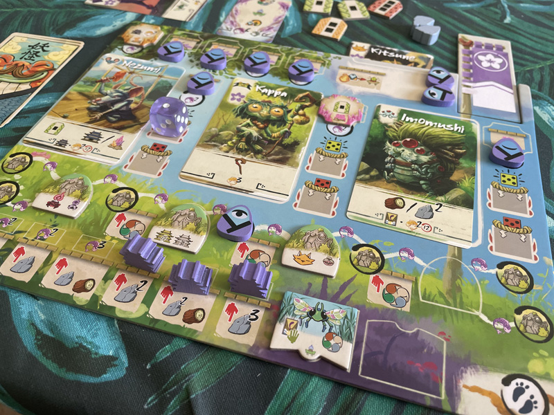 Il y a deux plateaux à gérer : le plateau principal sur lequel vous allez vous affrontez entre joueurs pour placer vos dés et être le premier à récupérer tel bâtiment, tel cristal, tel yokai ou tel bitoku, et votre plateau individuel sur lequel vous allez invoquer vos yokai et gérer vos pèlerins.