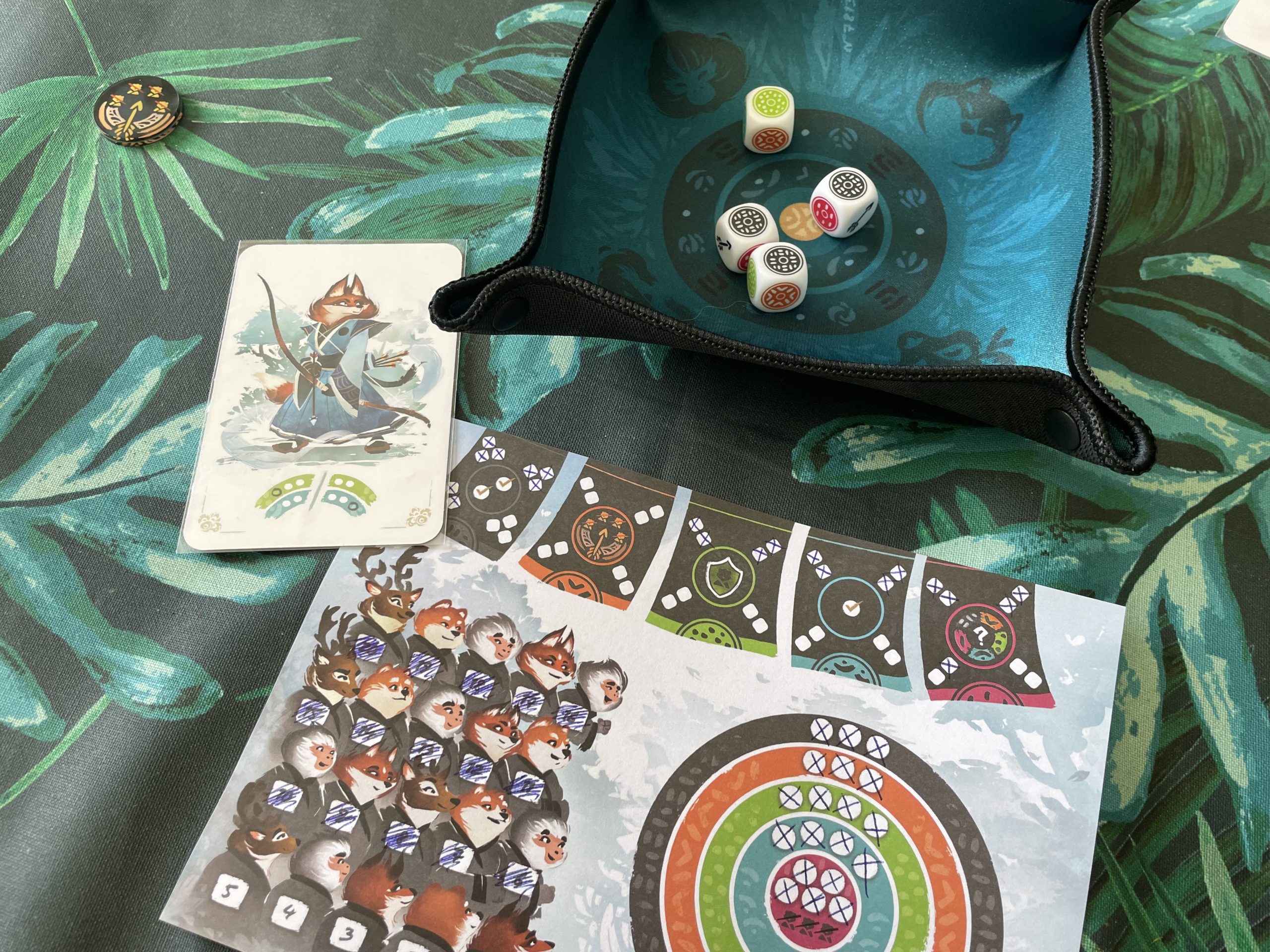 Le matériel est particulièrement qualitatif, sur quasiment tous les points : la piste de dés est belle et robuste (et elle a la particularité d’être unique ! Elles sont en effet toutes différentes, et numérotées), les jetons pouvoirs sont en plexiglass et les cartes sont protégées. En plus, une grande partie du matériel est fabriquée en France, directement dans l’usine de l’éditeur. Cependant, je regrette fortement l’utilisation de feuilles en papier pour les plateaux de jeu individuels. Depuis Welcome to the moon, il me semble tellement plus pertinents d’utiliser des plateaux effaçables avec des feutres, d’autant plus qu’il n’en aurait fallu que 4 dans Kyudo, plutôt que des feuilles jetables et ce que ce soit d’un point de vue autant pratique qu’écologique. Espérons que cette utilisation sera démocratisée dans les futurs Roll/Flip and Write !