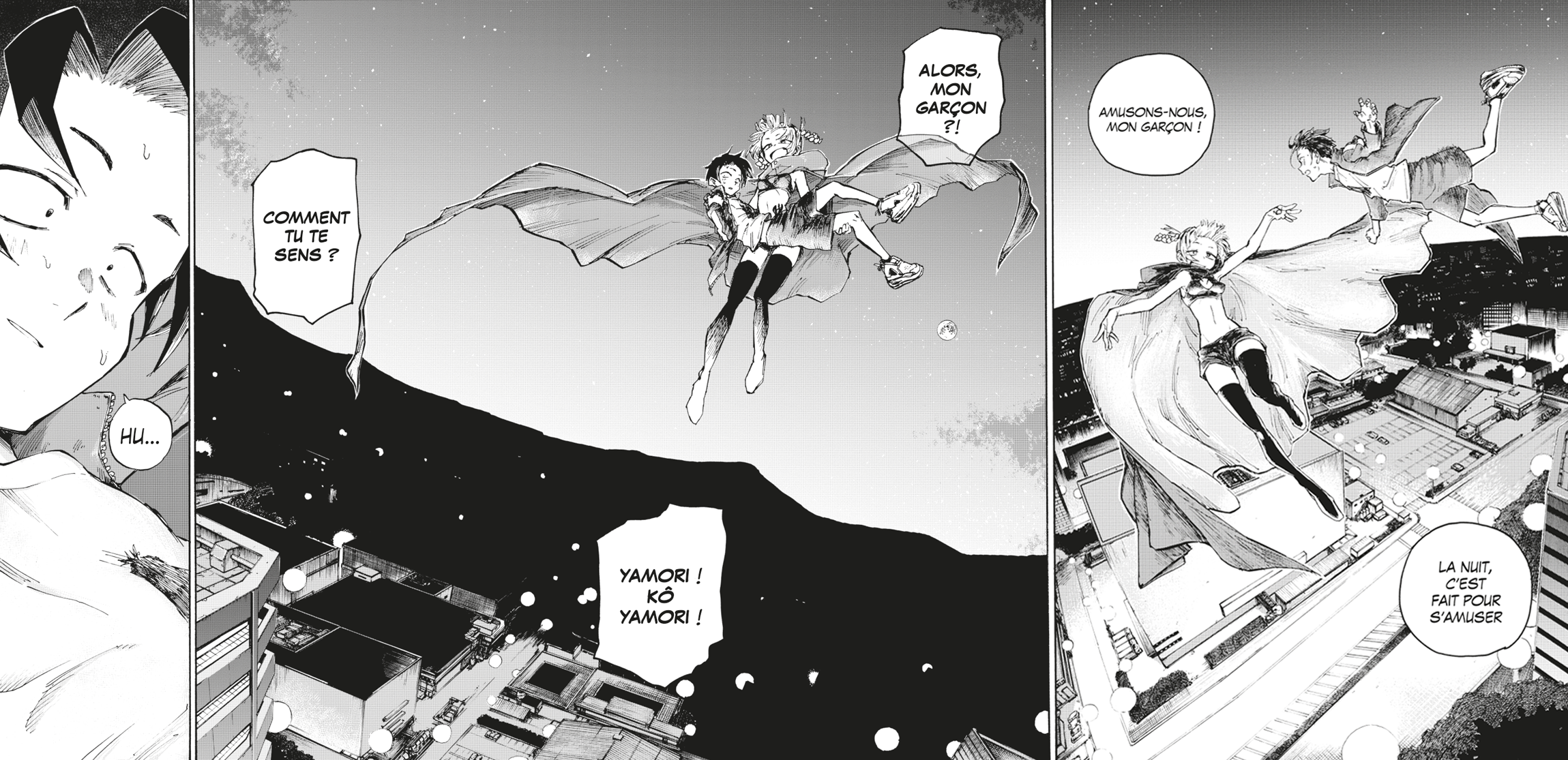 Pendant les quelques premières pages de l’œuvre, l’auteure décide de nous présenter la nuit à l’état brut. Kô erre sans réel but dans la nuit. C’est l’arrivée de Nazuna s’immisçant dans son espace vital lors d’un passage au distributeur de boissons qui va donner un grand coup de pédale au récit. Cette scène est claire comme de l’eau de roche : la nuit n’est pas comme elle se présente. Si le calme et la tranquillité font partie de ses composantes, la nuit peut être très rapidement bouleversée pour laisser place à des scènes d’une grande dynamique. Kotoyama nous prévient que la surprise peut surgir au moindre coin de rue.