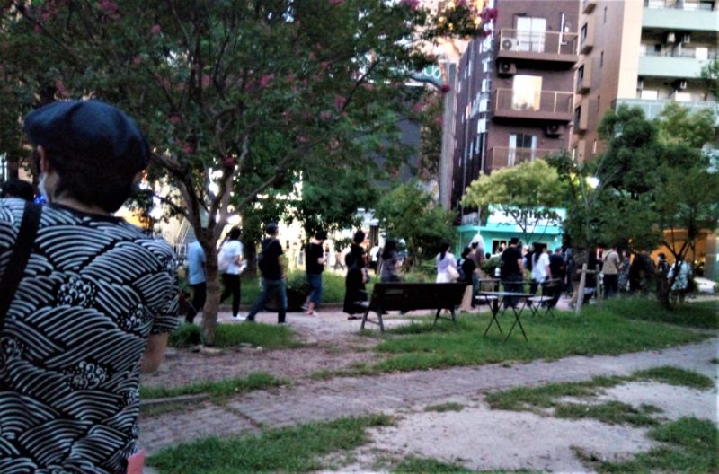 18 heures, le merchandising du groupe et de sa maison de disque installé à côté de l’entrée du Drum-be 1, célèbre salle de concert de Fukuoka, s’apprête à plier bagage pour s’installer à l’intérieur. De l’autre côté de la route se trouve un petit parc déjà noir de monde : plus de la moitié des personnes portent un tee-shirt de Ningen Isu, il n’y a pas de doute, le fan club est venu en force ! Parmi eux se trouvent autant de jeunes que de représentants de la génération des membres et les trois quarts environ sont des femmes. À 18h30, le staff commence à former des files d’attente dans le parc, en fonction du numéro de ticket de chacun, afin que nous entrions un à un dans la salle, sans bousculade. Une fois passées les portes nous attend la prise de température et la désinfection des mains, suivies par le contrôle des billets et le paiement de l’incontournable taxe qui accompagne tout concert japonais : le ticket pour la boisson. 600 yens pour avoir accès au bar, pass que l’on ne peut refuser de payer, même si on a prévu sa bouteille d’eau dans le sac.