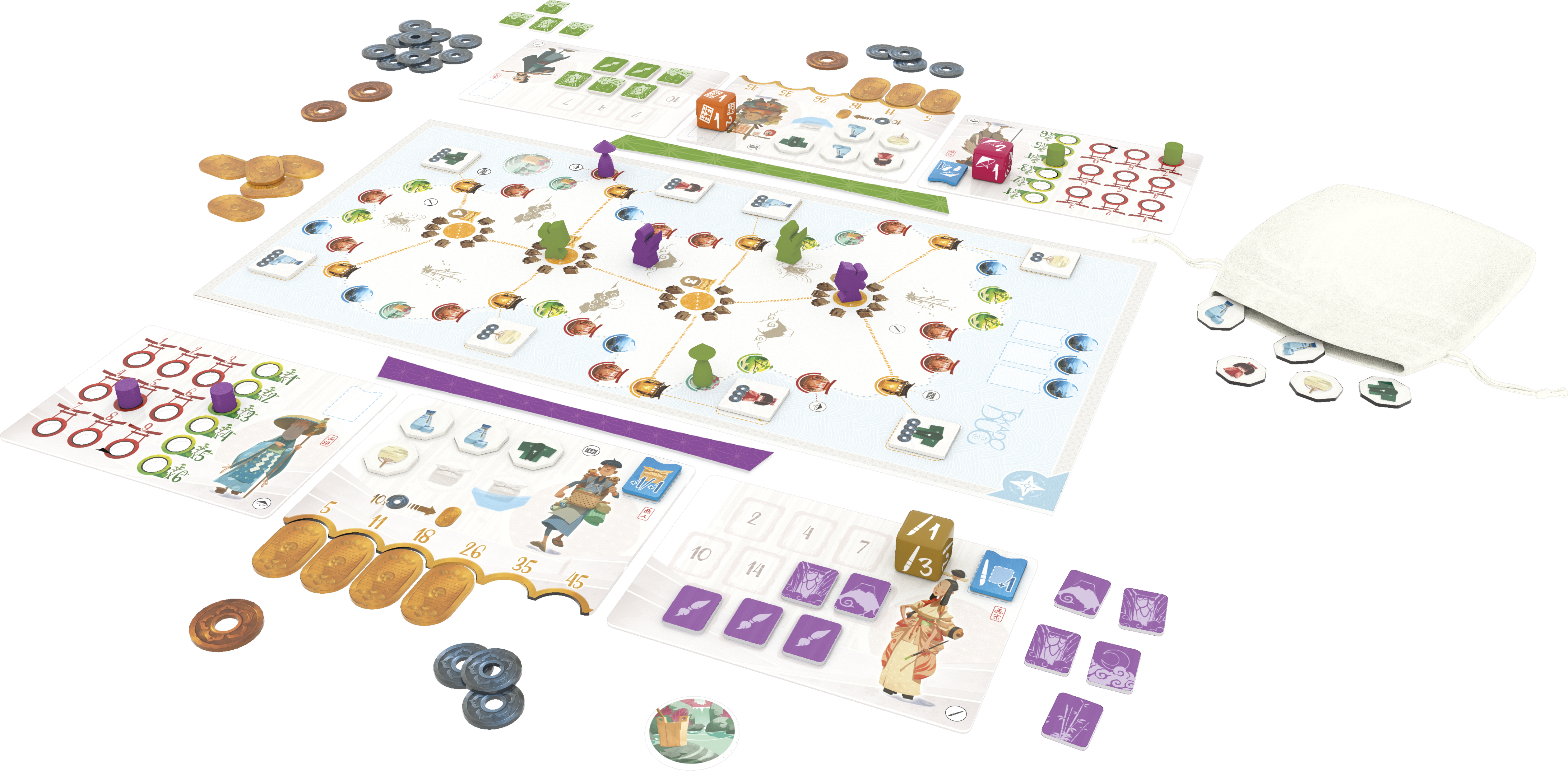 Si vous connaissez déjà Tokaido, alors vous ne serez pas perdus avec ce premier jeu puisque, comme son nom le laisse présumer, il s’agit tout simplement de la version 2 joueurs du célèbre Tokaido que nous vous avions présenté dans notre première sélection de jeu de société en 2019. Si dans Tokaido, vous incarnez un pèlerin en pleine quête personnelle sur l’île de Shikoku, dans Tokaido Duo vous incarnez cette fois-ci 3 personnages différents : un pèlerin, toujours, ainsi qu’un marchand et un artiste. Et cette « petite » différence change en réalité beaucoup de choses !