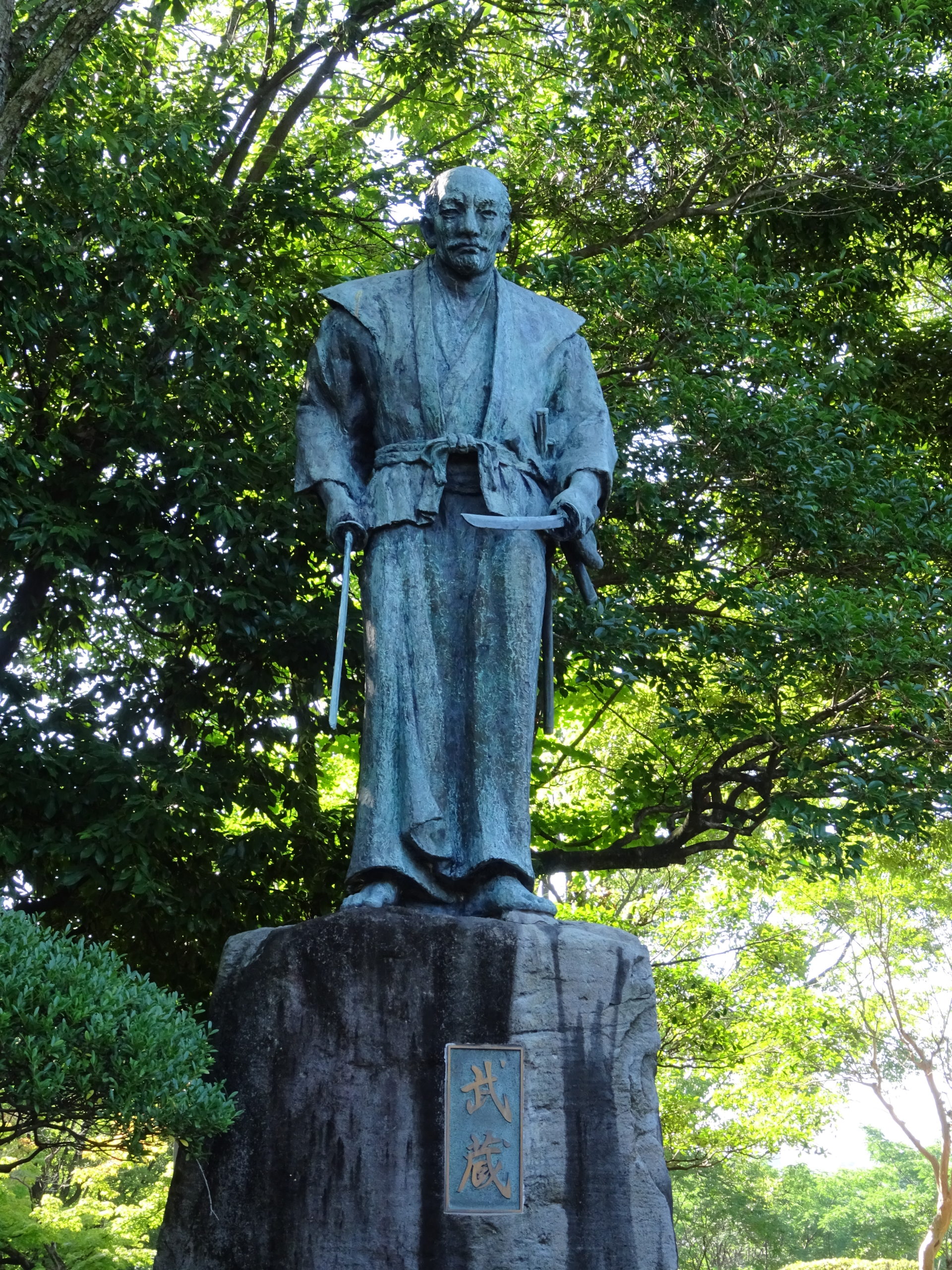 Au centre du parc se trouve une haute sculpture juchée sur un socle d’un mètre environ, qui représente un homme imposant en kimono, un sabre dans chaque main, au regard sévère et perçant : figure immortelle de la puissance à l’état brut. La statue en bronze s’appuie sur l’autoportrait effectué par Musashi à la fin de sa vie, qui est actuellement conservé au musée Shimada (Kumamoto). Il est amusant de constater que cette image a également inspiré Takehiko INOUE (1967), auteur du célèbre manga Vagabond pour dessiner non pas Musashi mais son père, Munisai SHINMEN. Tout autour de la statue sont placés des panneaux explicatifs qui retracent son histoire et indiquent les autres lieux à visiter dans le département pour marcher dans ses pas.