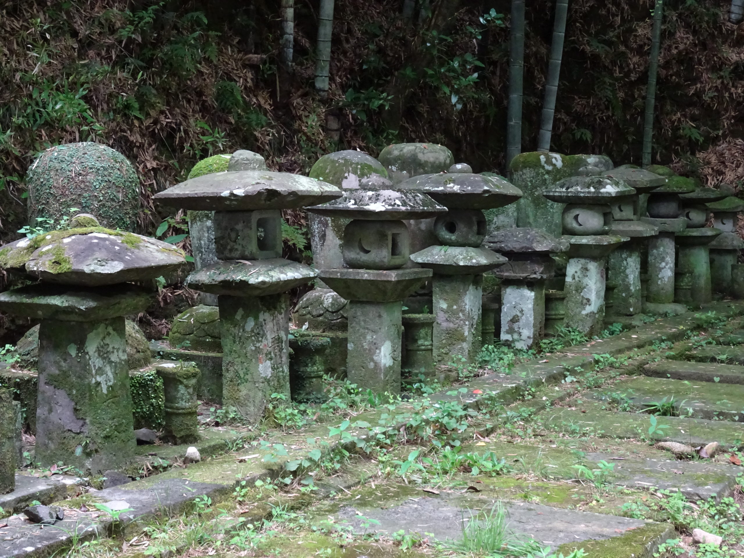 Écrin de verdure à la nature luxuriante, le parc naturel de Tatsuda offre un magnifique lieu de balade entre bambous, cèdres gigantesques et lanternes de pierre recouvertes de mousses. Situé sur le mont Tatsuda à l’ouest de la ville, derrière l’Université de Kumamoto, il appartient à la famille Hosokawa. Le site est ouvert au public en tant que parc naturel depuis 1955, à la suite des accords de prêt du terrain à la ville de Kumamoto qui ont été signés cette année-là. Tadaoki Hosokawa ayant été un maître de thé, élève du célèbre Sen-no-Rikyu (1522-1591), nous pouvons voir encore aujourd’hui dans l’enceinte du parc deux maisons de thé au toit de chaume situées au bord d’un étang qui ont été conçues par Tadaoki. Entrer dans ce parc constitue une plongée dans un monde enchanteur où l’histoire se mêle à la nature, dans une ambiance qui n’est pas sans rappeler les plus beaux films d’animation du studio Ghibli, entre Le voyage de Chihiro et Princesse Mononoke. En effet, outre la beauté du paysage naturel qu’il offre, ce lieu est également connu pour renfermer les tombes de plusieurs grands noms de la famille Hosokawa, dont celles de Tadaoki Hosokawa et de son épouse, Gracia Hosokawa (1563-1600). Quatre grands caveaux sont visibles au cœur du parc ainsi que des dizaines de stèles sur lesquelles sont gravés les noms de nombreux proches de la famille Hosokawa.