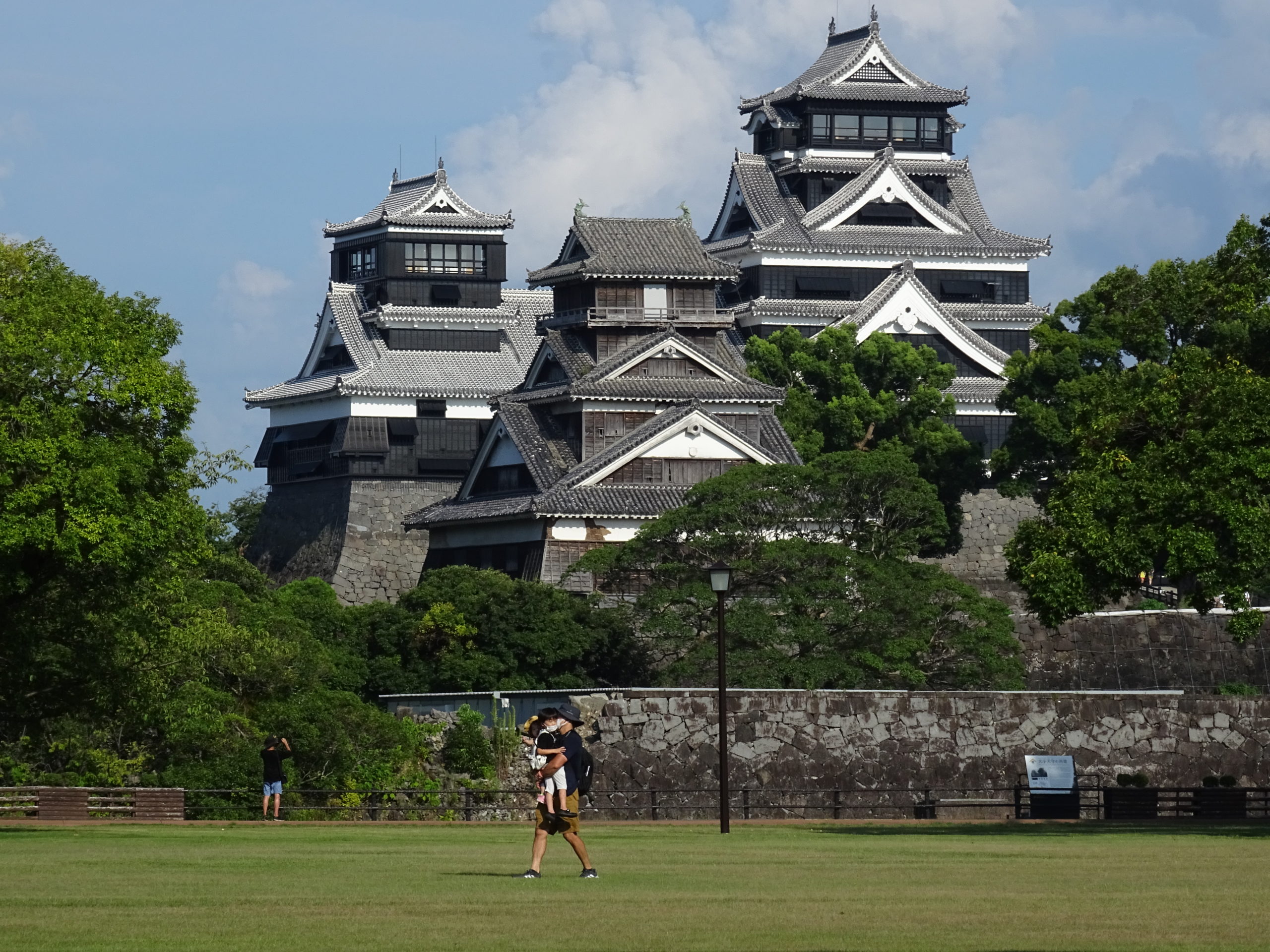 L’histoire du château commence à la fin du 15e siècle et voit réellement le jour au début du 16e, avec l’installation du daimyô Kiyomasa KATÔ (1562-1611) dans le fief. Incendié en 1877 durant la rébellion de Satsuma, il a été plusieurs détruit et reconstruit. En avril 2016, il s’est partiellement écroulé à cause des deux violents tremblements de terre qui avaient alors frappé la région. Encore partiellement en reconstruction à ce jour, il est néanmoins de nouveau possible de visiter le donjon et de se promener à l’intérieur des fortifications. Situé en haut d’une colline, en plein centre-ville, à proximité des deux grandes allées marchandes (shimotôri et kamitôri) et de la mairie, il surplombe Kumamoto et se laisse apercevoir depuis bien des endroits. Se promener dans l’enceinte du château et dans la ville basse aux bâtiments d’aspect traditionnel donne l’illusion d’avoir fait un bond dans le temps et de découvrir le Japon médiéval. Visiter le donjon, c’est entrer dans un musée.