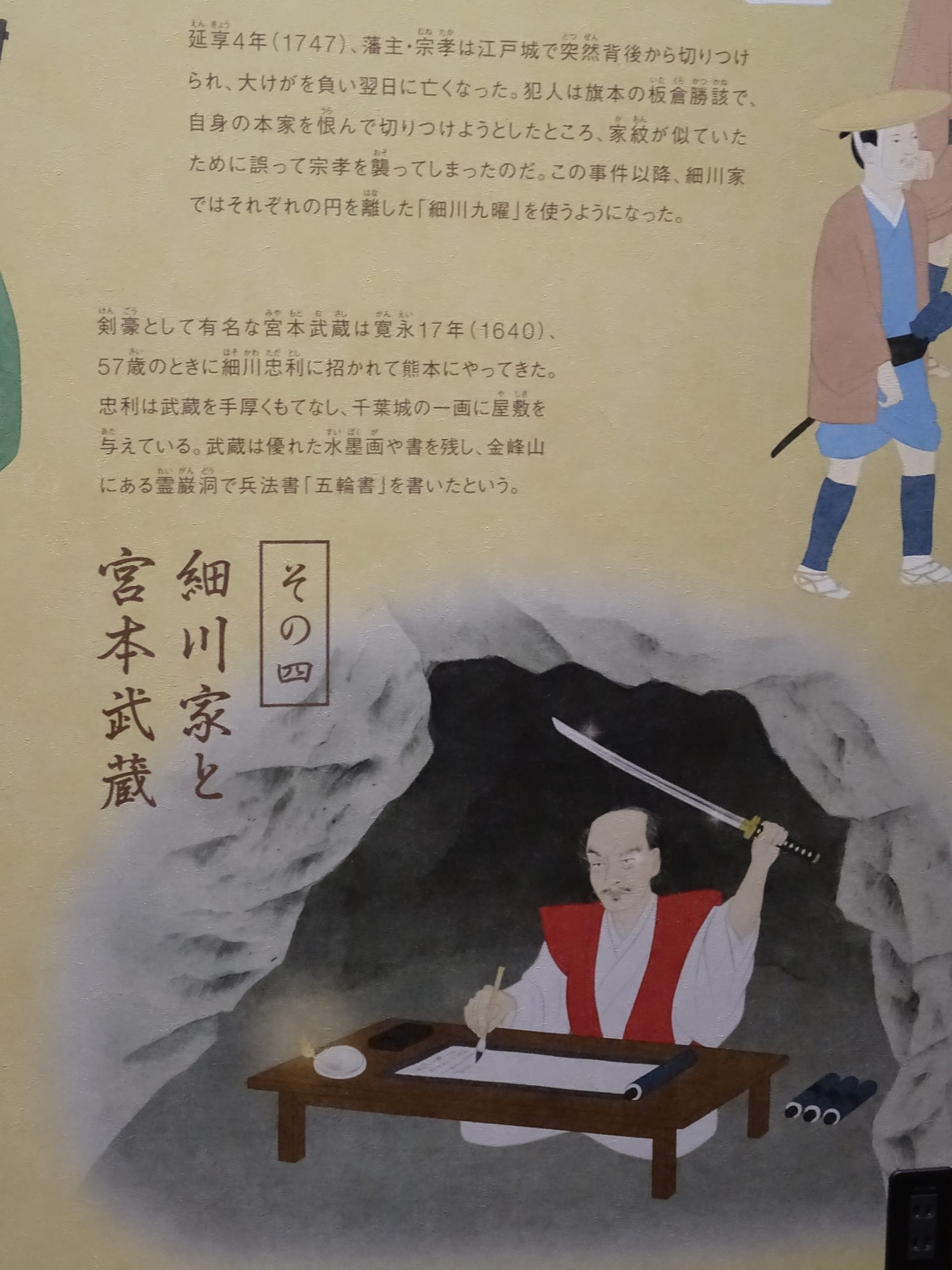 Les nombreux vestiges (tuiles, ornementations du toit, etc) des époques antérieures et les cartes d’époque qui y sont exposés permettent de se faire une idée du lieu tel qu’il était lorsque Musashi s’y rendait. L’un des murs du premier étage présente par ailleurs six anecdotes survenues sous le règne des Hosokawa, parmi lesquelles apparaît le maître de sabre. Le visiteur peut y lire ces quelques phrases accompagnées d’un dessin mettant en scène Musashi dans une grotte, en train d’écrire de la main droite sur un rouleau de papier tandis qu’il tient de la main gauche un de ses sabres levé au dessus de son visage.