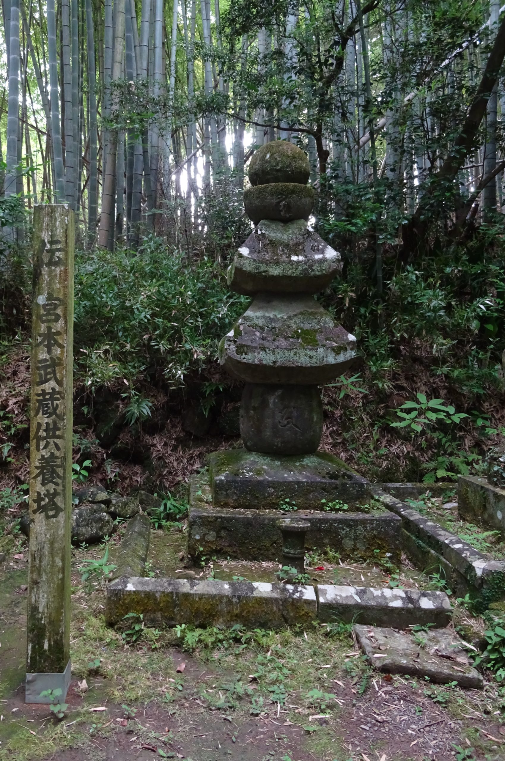 Le visiteur trouvera parmi elles une stèle dédiée à Musashi, qui compte pour l’une des cinq tombes qu’il possède dans tout le Japon. Sorte de tour à cinq anneaux, la stèle représente de cette manière les cinq chapitres du Traité des cinq roues que sont la Terre, l’Eau, le Feu, le Vent et le Vide, soit les cinq éléments selon le bouddhisme japonais.