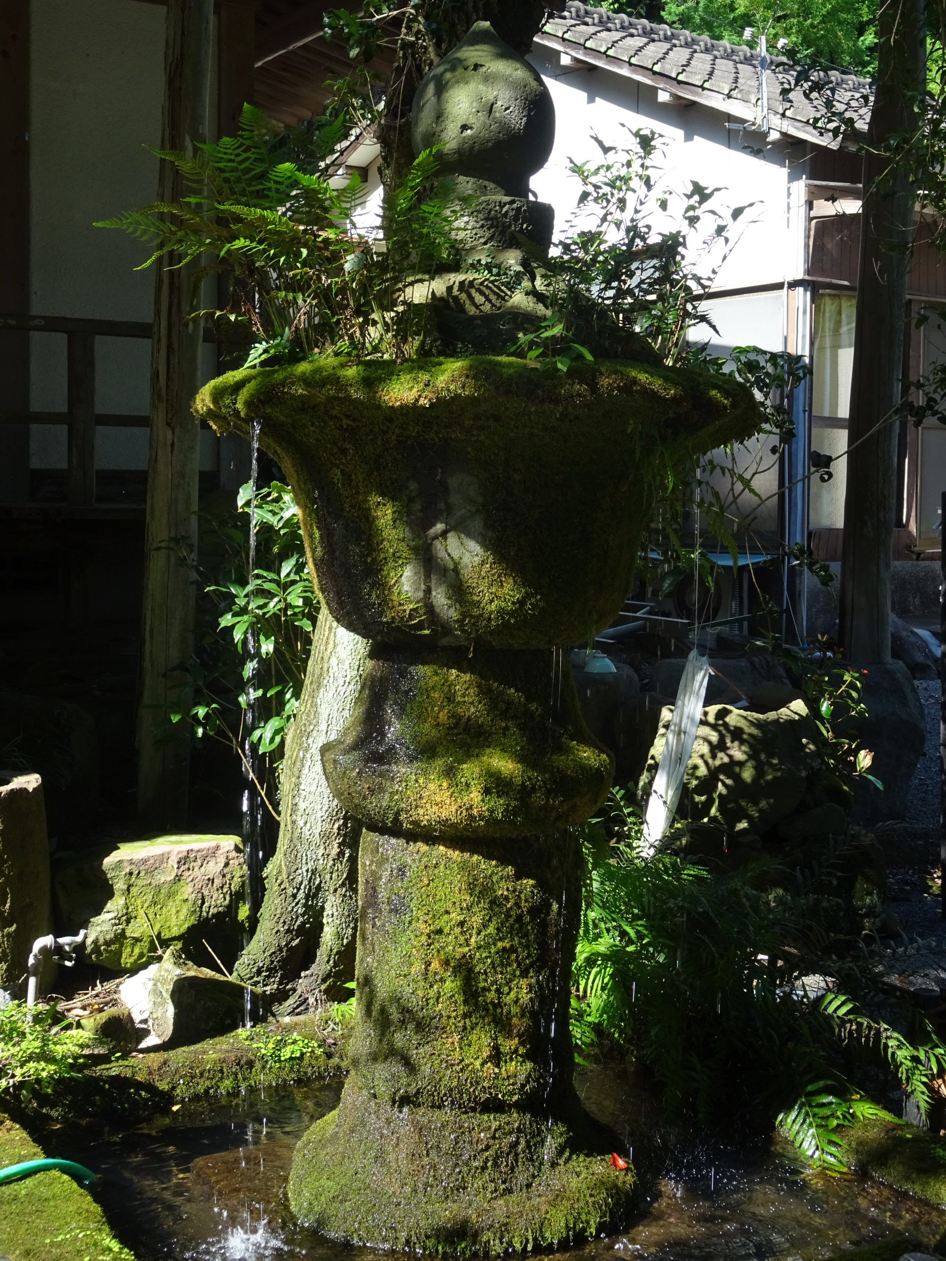 Les bâtiments traditionnels en bois, aux dorures des intérieurs bouddhiques et aux innombrables sculptures renferment dans leur cour une magnifique lanterne en pierre toute recouverte de mousses et de fougères, d’où s’écoule un filet d’eau. Le ton est donné : nous entrons dans le règne du calme, de la nature et d’un parfum d’ancestralité. Une fois payé le droit d’entrée de 200 yens seulement à l’un des moines en charge du temple et passé le portique rouillé qui grince à chaque passage, un chemin tout de pierres et de mousses s’ouvre à nous. Si la grotte constitue le site d’intérêt premier, le chemin qui y mène n’en est pas moins jonché de belles surprises. Vitrines où sont exposées les reliques du temple et des objets en liens avec Musashi, divers petits bâtis abritant des statues de Kannon et des arbres magnifiques…