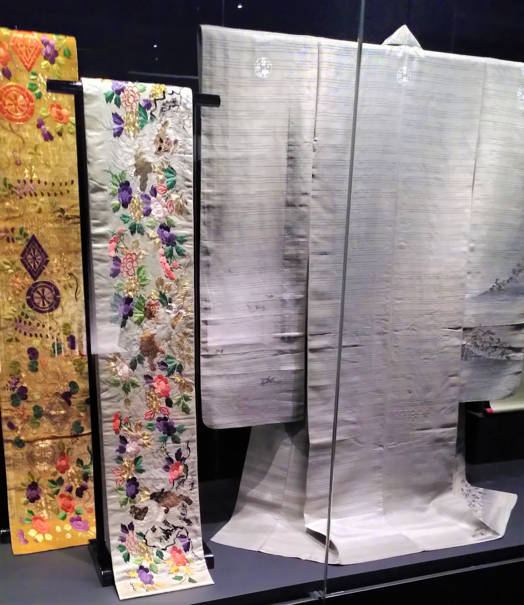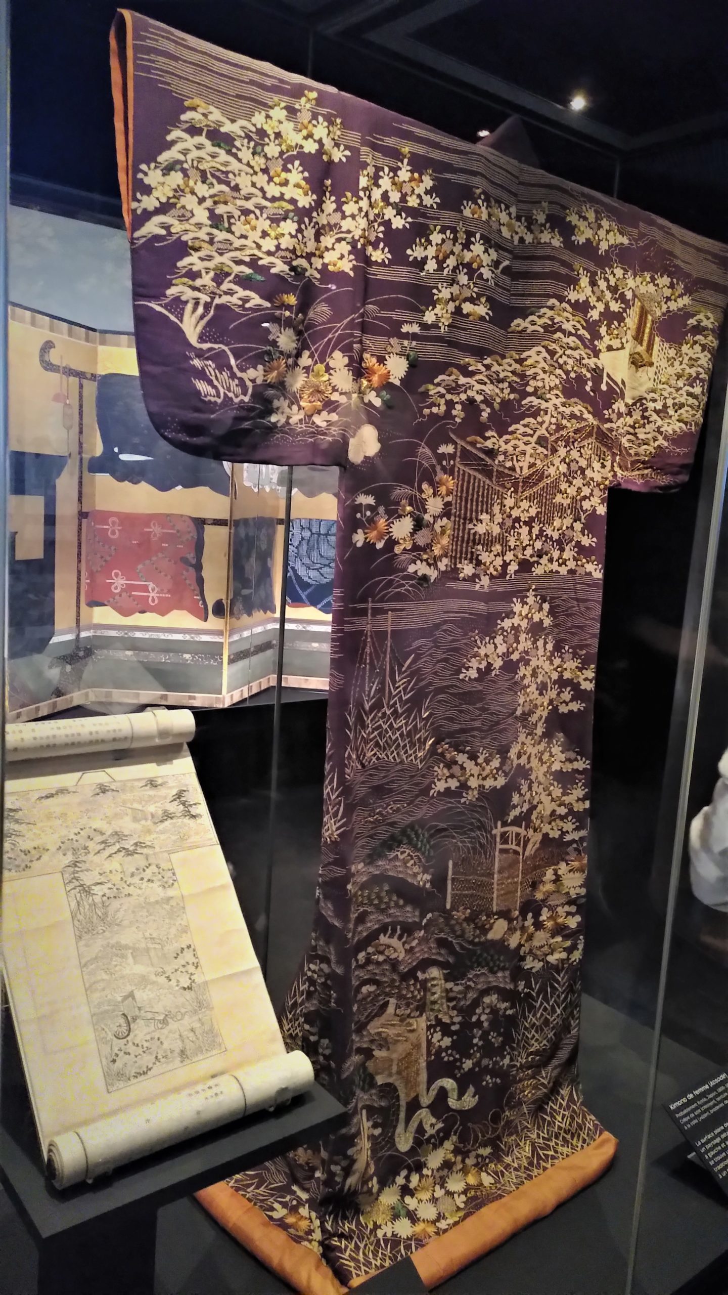 D’abord, comment la structure et la forme simples du kimono permettent aux artisans de développer leur créativité autant dans les techniques de tissage, teinture, broderie que dans le développement des motifs dont certains se rapprochent d’une peinture ou reprennent des contes et légendes. La position des motifs est pensée en fonction du placement et du mouvement du tissu sur le corps, et l’adéquation entre techniques de tissage, techniques de teinture et de broderie donne des pièces d’une extraordinaire beauté que l’éclairage des vitrines permet d’apprécier. C’est un âge d’or pour les artisans de l’époque.