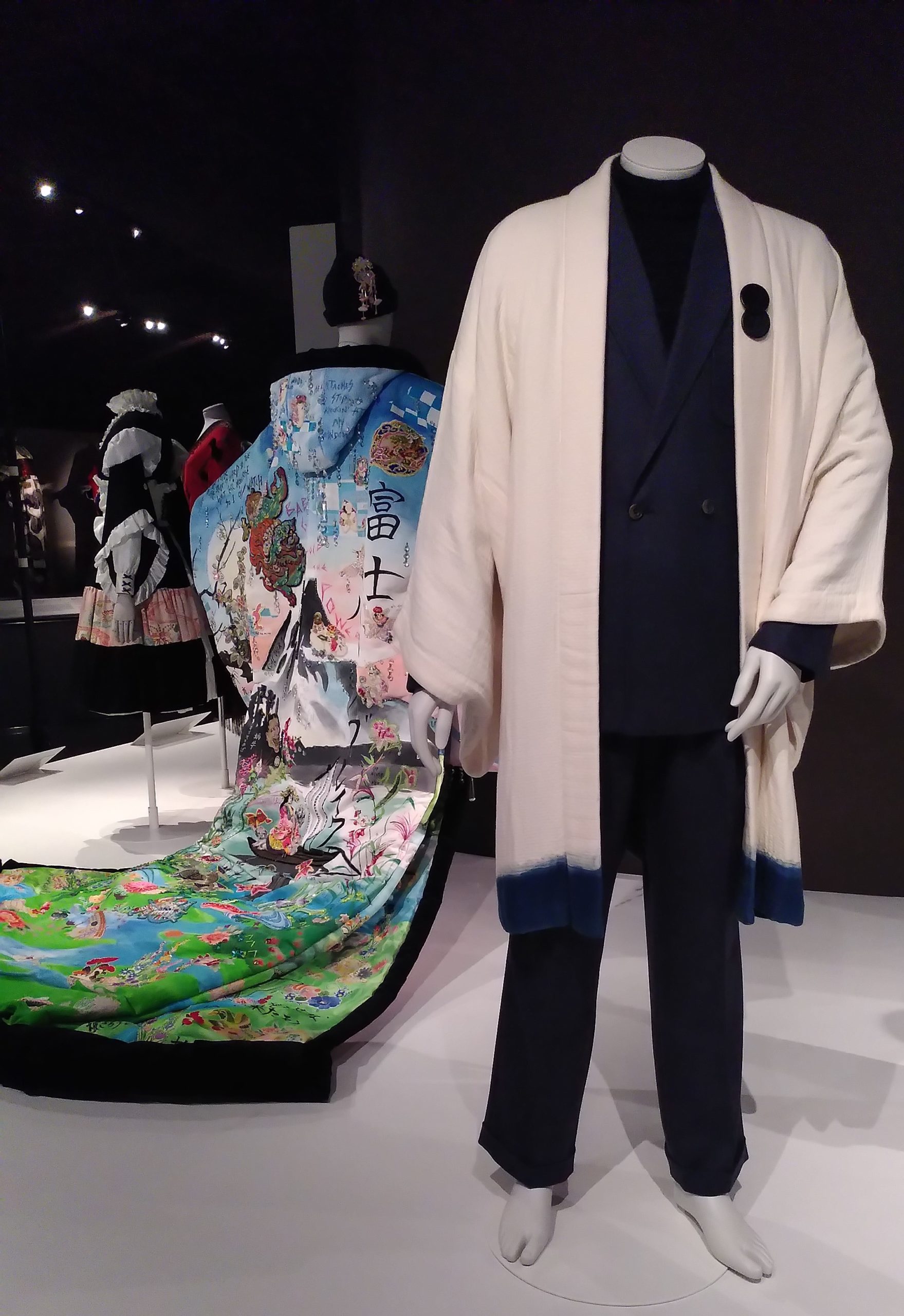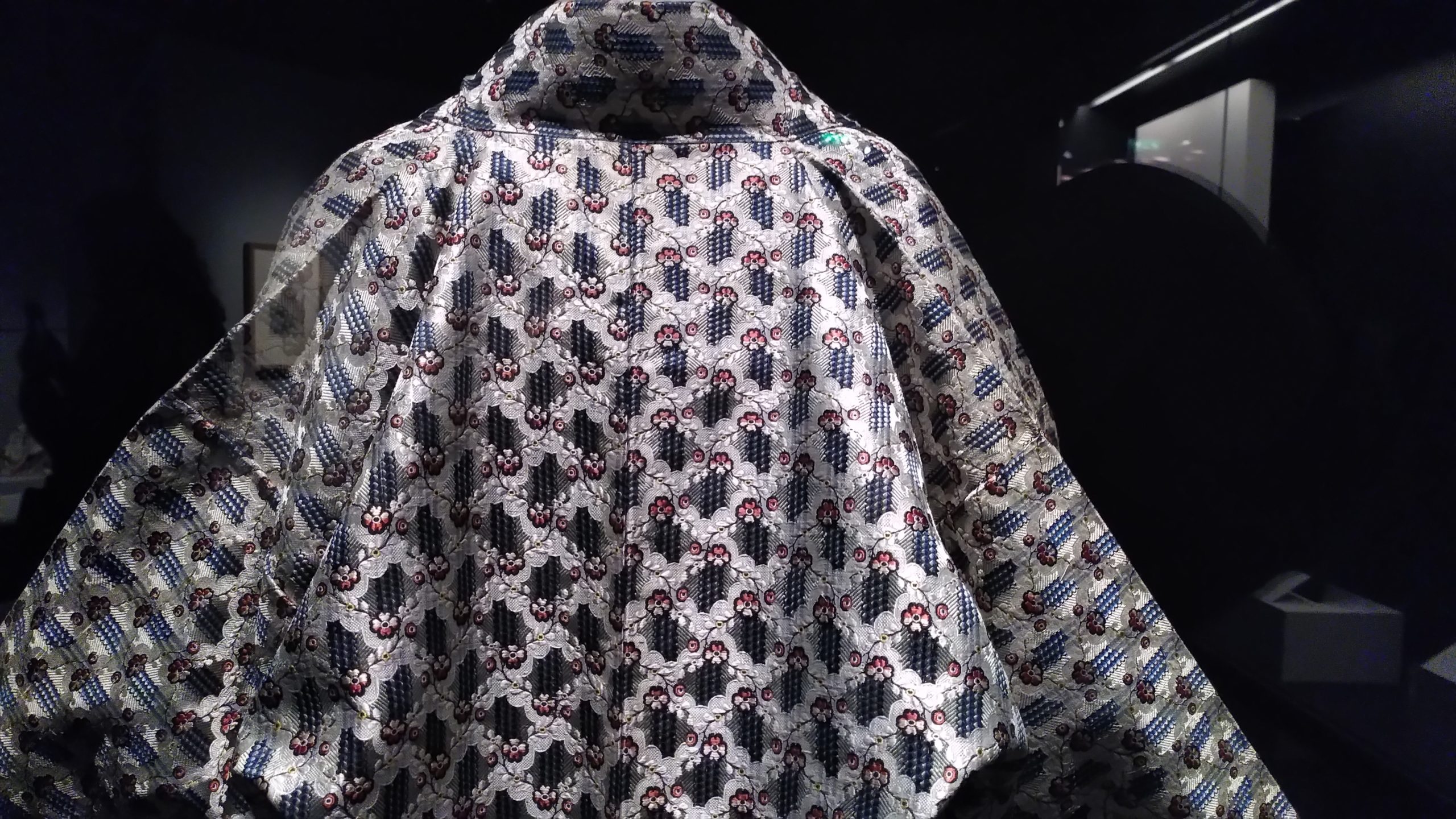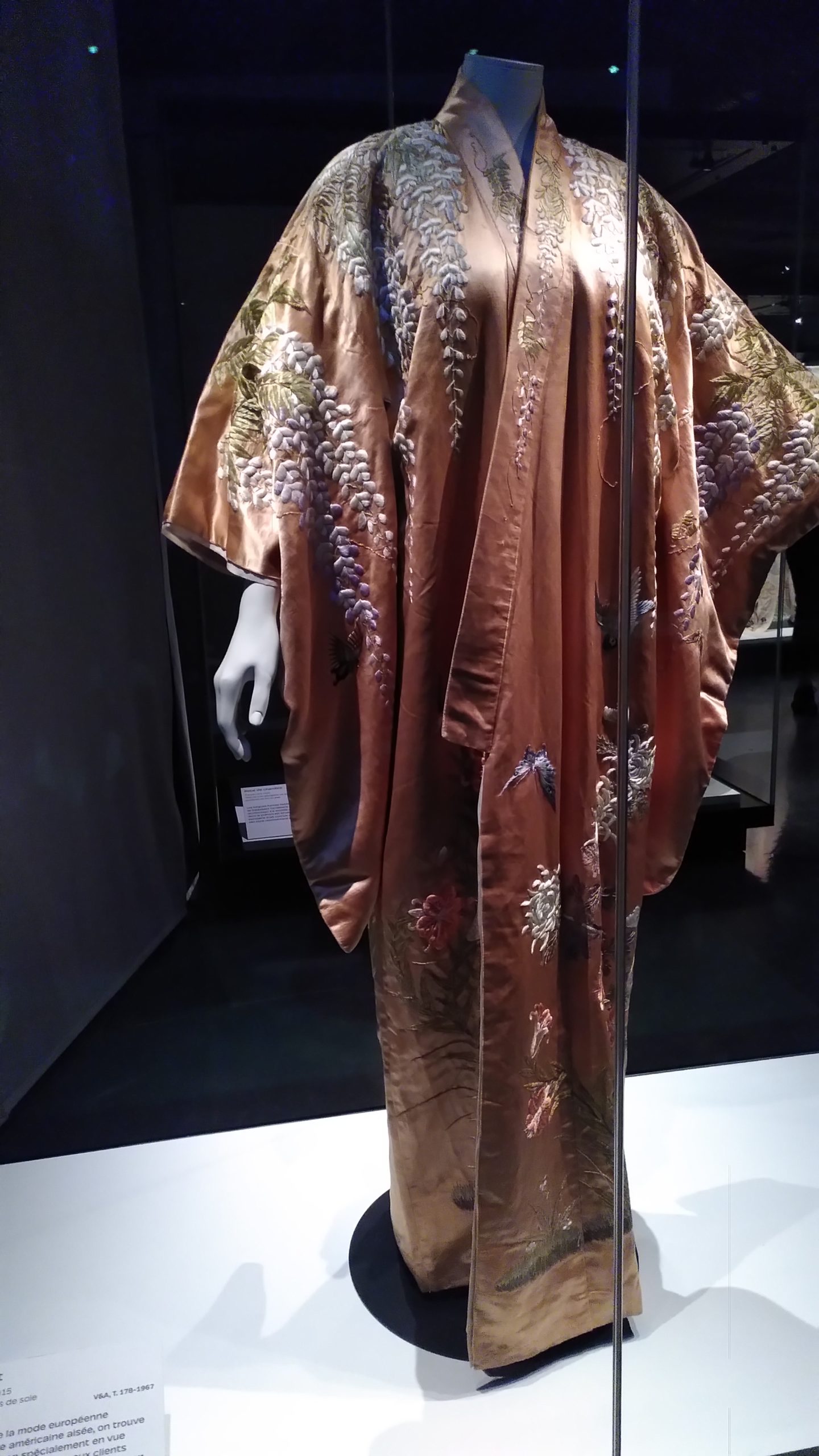 Mais ce qu’on l’on découvre est à quel point le kimono a changé la mode européenne et la manière dont le vêtement a été envisagé en Europe même. Si, comme le montre l’exposition, une partie de l’attrait des riches européens fut d’abord celui de l’exotisme et du paraître aux 18e et 19e siècles, période connue sous le nom de Japonisme, les créateurs de mode s’emparent de la structure simple du kimono et de sa forme ample pour renouveler les garde-robes et le style européens, notamment dans la mode féminine d’intérieur. Plusieurs vitrines donnent à voir les amples gilets et les kimonos revisités (formes, couleurs, motifs) et font directement écho dans notre esprit avec la fameuse forme kimono du vestiaire occidental, connue et populaire encore aujourd’hui. Les hommes n’étaient pas en reste mais les habits masculins ayant survécu au passage du temps sont plus rares. On peut néanmoins admirer un magnifique peignoir ayant appartenu à un riche Écossais ainsi qu’un étonnant costume 3 pièces décorés d’éléments asiatiques.