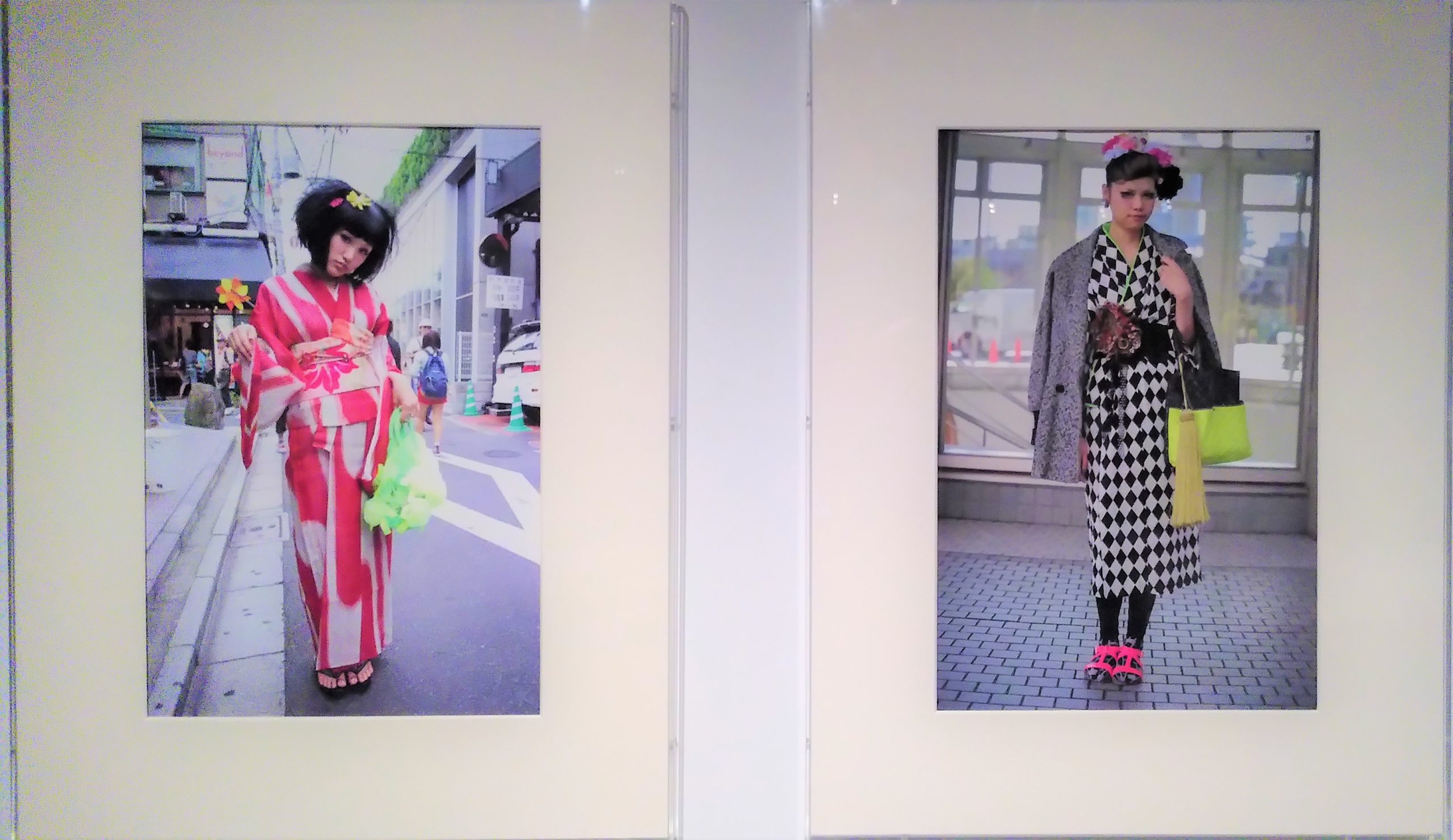 La troisième et dernière partie de l’expo présente la création contemporaine. Longtemps source d’inspiration pour la haute couture, le kimono connaît aujourd’hui le succès à la fois auprès des jeunes Japonaises et Japonais, lassés du renouvellement incessant de la fast fashion, et chez les créateurs internationaux d’une mode plus casual wear. Dans les deux cas, le côté global et atemporel du kimono ressort avec force et évidence. Les Japonaises dénichent des kimono vintage, en seconde main, qu’elles portent en l’état ou customisés. Revisités de la sorte, accessoirisés de sacs, bijoux et maquillages actuels, l’hybridation stylistique fonctionne bien et le mélange entre tradition et présent matche : l’intégration du kimono dans le Japon du 21e siècle est belle. A quelques pas des photos des jeunes citadines japonaises, la collection Wafrica de Serge Mouangue démontre un métissage réussi entre deux cultures textiles et vestimentaires fortes et que l’on aurait tendance à opposer. Le kimono japonais et le tissu africain fusionnent à merveille et transcendent les frontières, les cultures ainsi que les traditions et les préjugés dans une exceptionnelle modernité. Voici, la preuve évidente d’une « troisième voie » ou d’un autre possible car si le vêtement est porteur d’identité et de territoire, clairement, la proposition de Serge Mouangue étend ces notions-même.