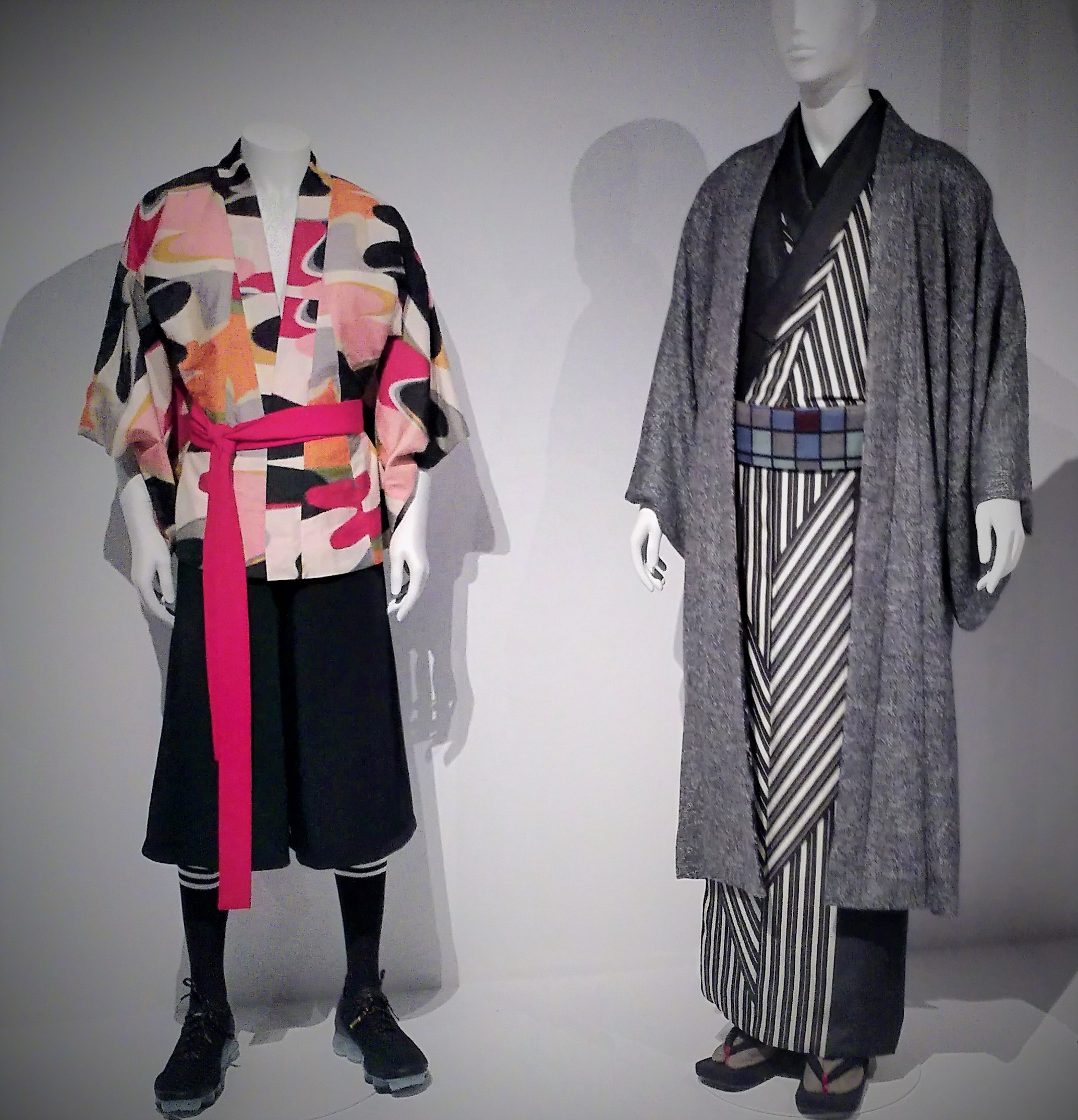 Autre vision contemporaine et pertinente du kimono est celle offerte par la mode masculine. Les modèles pour hommes occupent la moitié de la pièce. Ils proposent des styles ultra modernes qui mixent le kimono avec la mode et les accessoires masculins actuels ou font du kimono l’élément clé qui apportent aux tenues élégance et originalité. Sont exposés des modèles de la collection 2016 de Thom Browne alliant kimono et costumes occidentaux, ou encore de Akira ISOGAWA, mixant codes du style australien, son pays d’adoption, avec ceux du kimono. A noter aussi la présence de modèles de Jôtarô SAITO et de Yohji YAMAMOTO qui, à travers leur revisitation du kimono, affirment leur conviction que les distinctions de genres n’ont plus lieu d’être, que ce sont de simples mots qu’il est facile d’oublier. Le modèle exposé de Yohji YAMAMOTO brouille la frontière du genre quant à celui de Jôtarô SAITO, il efface littéralement la distinction féminin-masculin dans sa présentation même de modèle unisexe. Le tout dans une parfaite fluidité. Tout colle, tout fusionne, tout est cohérent et pertinent. On arpente cet espace d’exposition avec une vision enrichie du kimono allant au-delà de son image fantasmée, et amenant clairement l’idée qu’il est un véritable atout pour l’avenir de la mode.
