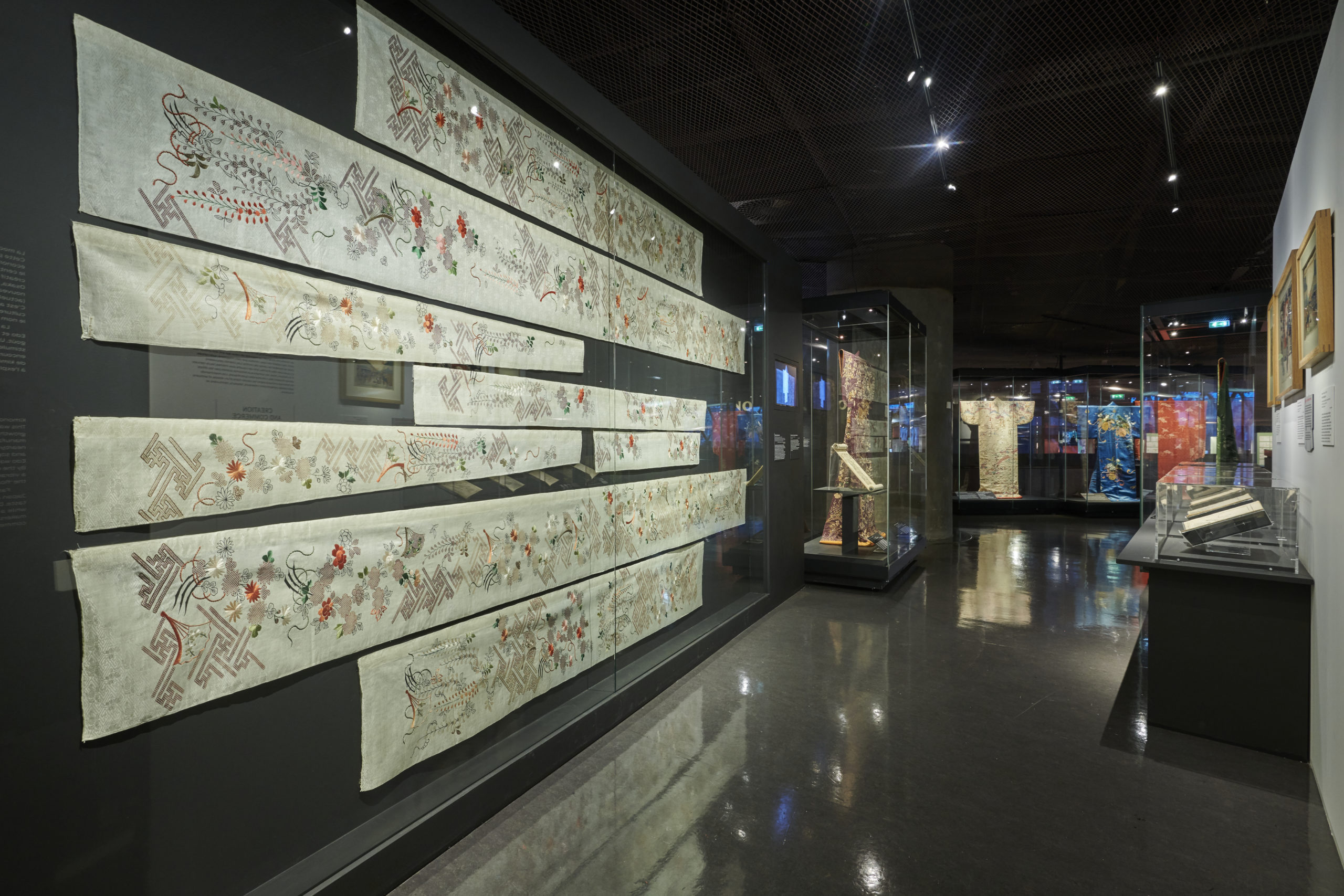 La seconde partie de l’exposition montre à quel point le kimono s’est rapidement popularisé en Europe dès le 17e siècle mais aussi comment les tissus et les motifs européens ont pénétré le marché japonais. La demande en kimono pour l’exportation s’accroît rapidement et pour suivre le rythme de production, les Hollandais fournissent même du tissu aux artisans japonais. C’est ainsi que des tissus produits en Angleterre, sont transformés en kimono au Japon avant d’être exportés à nouveau vers l’Europe ou vendus au Japon. Ce succès développe aussi une production de kimono sur le sol européen même, par des fabricants textiles bien installés. Les modèles présentés montrent l’interpénétration des styles des deux côtés, créant un métissage parfois surprenant, comme l’ajout de col de chemise ou la construction en forme de jupe, et parfois pertinent, comme l’appropriation du motif du faucon – inédit jusque-là au Japon – ou l’usage de techniques de tissage et broderie purement européennes pour des kimonos japonais. Dans l’espace d’exposition, les superbes modèles de kimono portés par des Européennes répondent aux fabuleux kimonos des Japonaises, visibles dans la première partie de l’exposition.