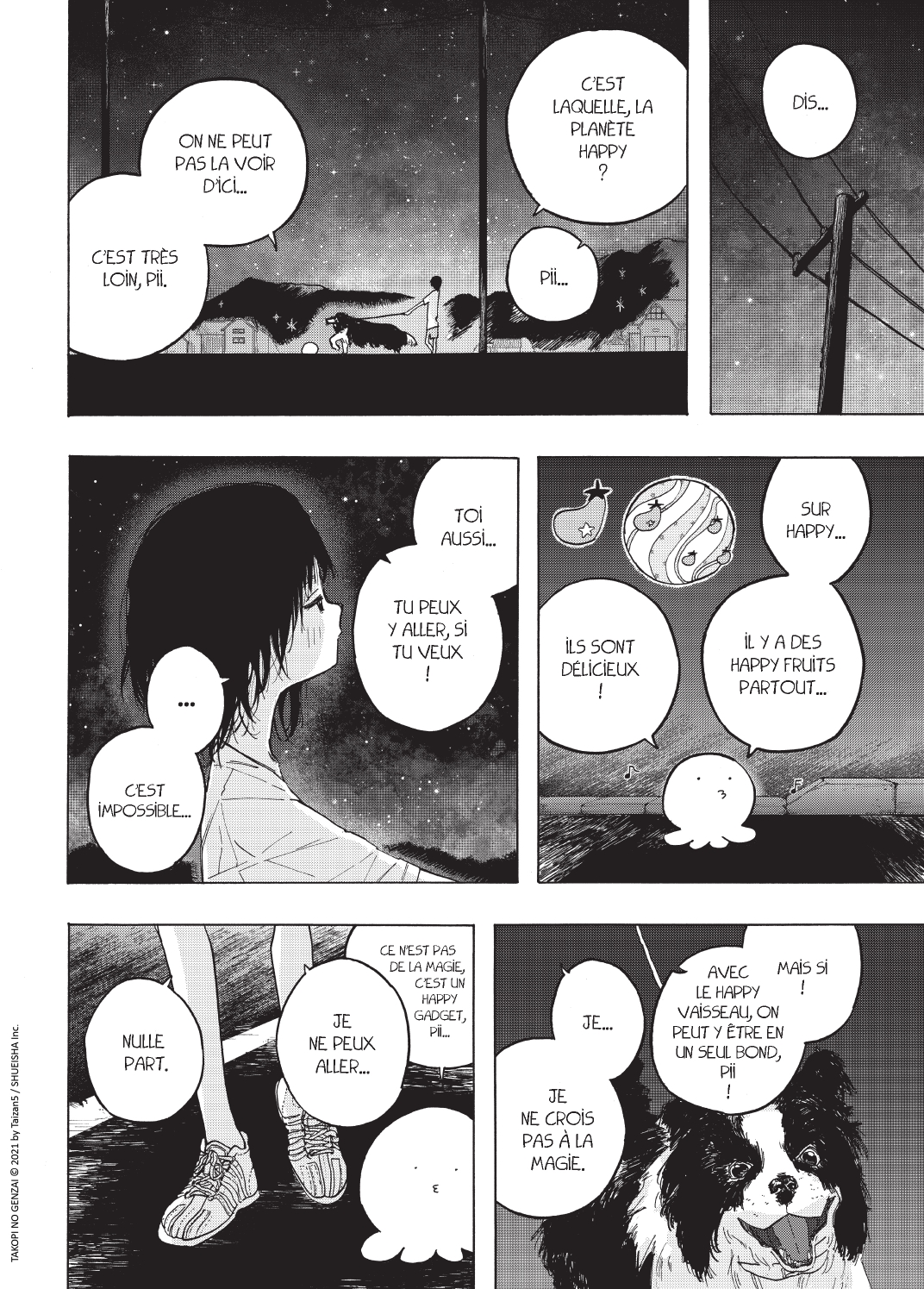 Ces deux dernières sont publiées dans le Shonen Jump +, la plateforme numérique du magazine de prépublication N°1. Accéder à ce magazine, même via sa version en ligne, est déjà un gage de réussite certain. Ces deux histoires courtes apportent une petite notoriété à Taizan5, et nous sommes à peine en 2021 que l’auteur se voit donner l’opportunité de lancer une série : Takopi no Genzai. 16 chapitres qui vont émouvoir les lecteurs japonais, et qui donneront naissance à deux tomes en format physique vendus rapidement à 1 million d’exemplaires. Ce genre de phénomène ne passe pas inaperçu auprès d’éditeurs français, Pika l’a bien compris.