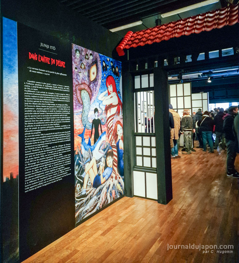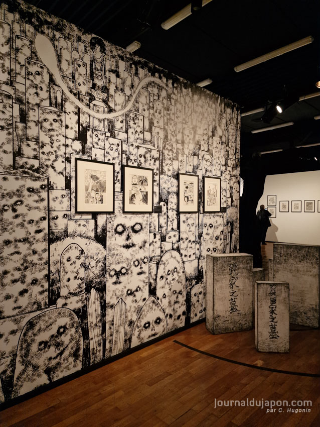 On débute ce premier focus avec une exposition en mode immersive de l’œuvre dans son ensemble du mangaka Junji ITÔ. Si vous ne connaissez pas ou peu l’auteur, on vous invite à découvrir les différents articles écrits par l’équipe de Journal du Japon, notamment celui-ci traitant de ses séries chez l’éditeur Mangetsu, qui permet de bien résumer le trait de l’auteur et ce qu’il recherche dans ses récits. L’exposition, réalisée dans le cadre d’Angoulême, intitulée « Junji Itô – Dans l’antre du délire« , a en effet été mise en place avec la collaboration des éditions Mangetsu. Cette dernière avait une belle mise en scène, en reprenant certains décors que l’on peut retrouver dans les histoires du mangaka. Ainsi, vous débutiez par entrer dans une maison ancienne, avant d’aller progressivement vers l’extérieur et une série de pierre tombales grandeur nature, représentant un petit cimetière d’âmes errantes avant de devoir passer sous un véritable torii et découvrir l’œuvre majeure de l’auteur : Tomié afin de terminer le cheminement dans son art.