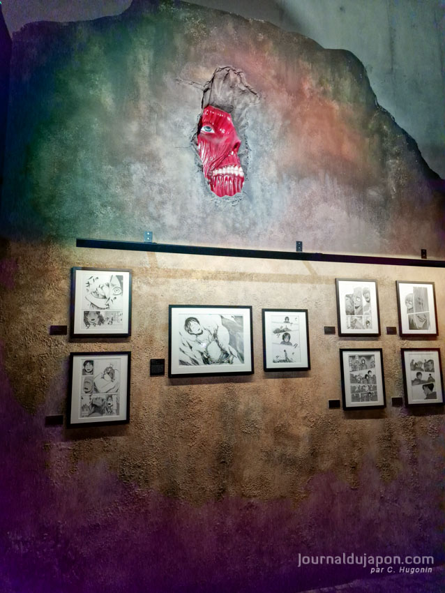Et pour cause ! Là aussi, tout comme celle de Junji Itô, le lecteur avait le droit à une véritable mise en scène qui permettait une belle immersion, et ce, dès l’approche de l’exposition. Entendre par-là que de nombreux titans semblant tombés du ciel accueillaient les visiteurs dans le lieu où se passait l’exposition afin d’ouvrir la voie vers cette dernière. Et une fois à l’intérieur, vous vous retrouviez tout simplement entre les murs de Shiganshina and co ! Le visiteur déambulait ensuite au fil de l’exposition pour finalement sortir des murs, pour atteindre une sorte de bunker avant d’enfin voir la mer tout comme Eren, Mikasa et Armin la découvre. On passe ensuite à un aspect plus extérieur, comme le propose le récit en réalité, reprenant exactement le cheminement qu’a pu entreprendre le trio maintenant célèbre de ce manga. Néanmoins, il valait mieux avoir lu la série dans son ensemble, ou être à jour avec l’animé, pour ne pas se faire spoiler par les différentes planches originales proposées !