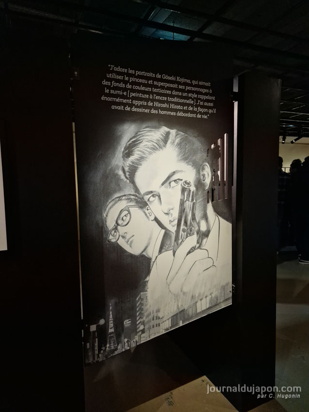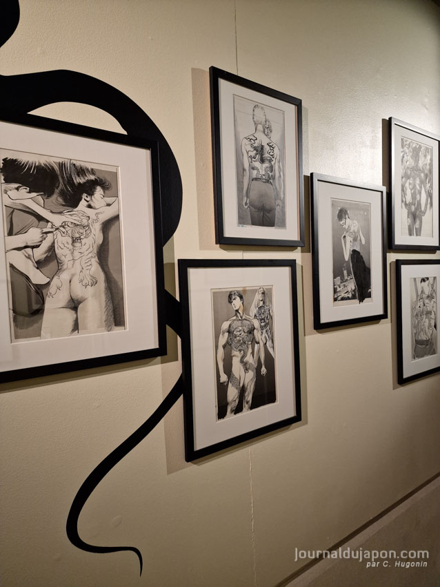 L’exposition, intitulé sobrement « Ryôichi Ikegami, à corps perdus » retrace justement le périple parcouru par le mangaka durant sa carrière : de ses débuts un peu chaotique, avant de trouver ses marques stylistiques, et de comprendre finalement qu’il serait aux services des autres. Cela permit d’offrir des séries mythiques comme Sanctuary, en cours de sortie en France depuis 2022, et de revoir bientôt à nouveau dans les rayons Crying Freeman qui a été la série qui l’aurait fait réellement connaitre du grand public. L’exposition retrace donc son œuvre, de ses débuts jusqu’à aujourd’hui, mais surtout permet de mettre un coup de projecteur bienvenue sur son coup de crayon réellement bluffant et saisissant de réalisme ! On y perçoit à merveille toutes les recherches graphiques qu’il se permet, notamment celle au sujet de l’esthétique des corps, mais aussi de la mode et des tatouages, et le rendu des émotions. Ryôichi Ikegami a mis son crayon au service du plus grand nombre afin de transmettre toujours plus aux autres et cela se ressent.