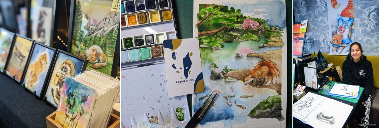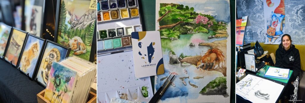 L’artiste Ladraweuz, Johanna de son vrai prénom, proposait diverses aquarelles de portraits animaliers ou humains. Pour le mini matsuri, on pouvait retrouver des illustrations en lien avec le Japon : avec notamment, un shiba inu (j’ai craqué pour ce cadre rappelant trait pour trait ma chienne Obi), des tanuki et kitsune pour la touche yôkai et des paysages.