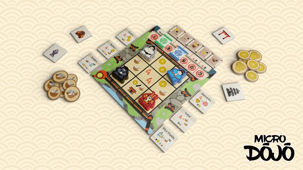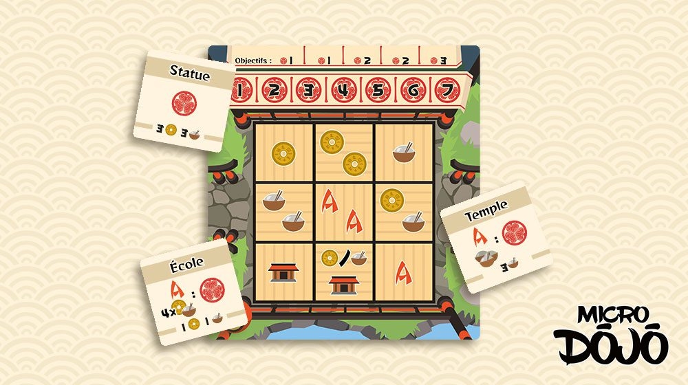 Micro Dojo est un tout petit jeu de plateau sur la base de règles très simples. À chaque tour, le joueur réalise 2 étapes : déplacer un pion, et activer l’effet de la case choisie. C’est alors sur cette dernière que le jeu prend toute sa dimension : vous pouvez choisir de récupérer de l’or ou de la nourriture, construire un bâtiment ou retirer l’un de vos bâtiments pour obtenir un point de victoire, ou effectuer une action (déclencher un objectif pour obtenir un point de victoire ou activer un bâtiment pour échanger des ressources ou donner des jetons d’Or ou de nourriture contre un point de victoire). Le premier joueur qui atteint les 7 points de victoire gagne la partie. À défaut d’avoir atteint les 7 points, le jeu se termine lorsque le denier objectif est complété.