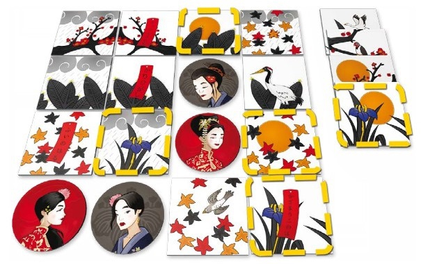 Le jeu se joue avec 16 tuiles qui forment le jardin impérial dans lequel vous allez devoir placer vos geisha. Ces dernières sont placées au hasard sur un format de 4×4, face visible, et présentent des végétations (des feuilles d’érable, une branche de cerisier…) et des spécificités différentes (un oiseau, des nuages…). Tour à tour, les joueurs vont remplacer une tuile jardin par l’une de leurs geisha. Comme vous vous en doutez, les placements de ces geisha ne sont pas libres : c’est votre adversaire qui va vous contraindre, et vous qui allez le contraindre en retour.