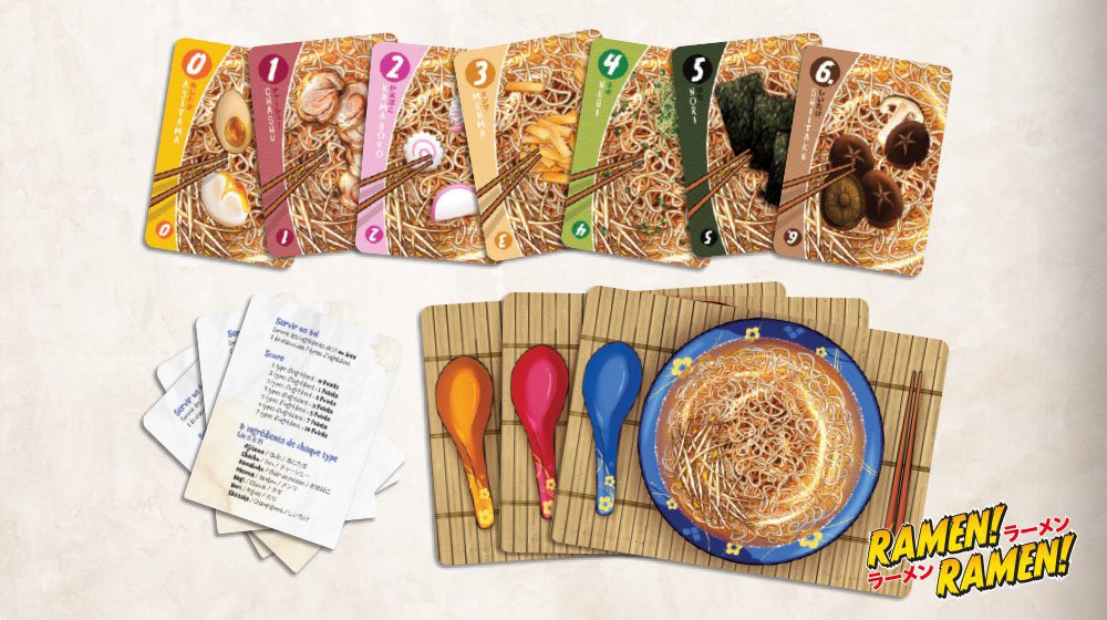 Dans Ramen! Ramen! vous incarnez un jeune cuisinier qui doit préparer le plus de ramen possibles, tout en étant délicieux ! Car oui, les clients attendent longtemps avant d’être servis, il ne faut alors pas les décevoir. Pour réaliser votre tâche, vous avez entre les mains 4 cartes d’ingrédients et sur la table 3 bols de nouilles à agrémenter avec vos toppings, ainsi que 4 cartes d’ingrédients supplémentaires faces visibles, disponibles pour votre adversaire ou vous. Il y a 7 ingrédients différents : les œufs (ajitama), le porc (chashu), la chair de poisson (kamaboko), le bambou (menma), la ciboule (negi), les algues (nori) et les champignons (shiitake). Les cartes des différents ingrédients sont numérotées de 0 à 7, chaque ingrédient ayant une carte 0, une carte 1, et ainsi de suite.