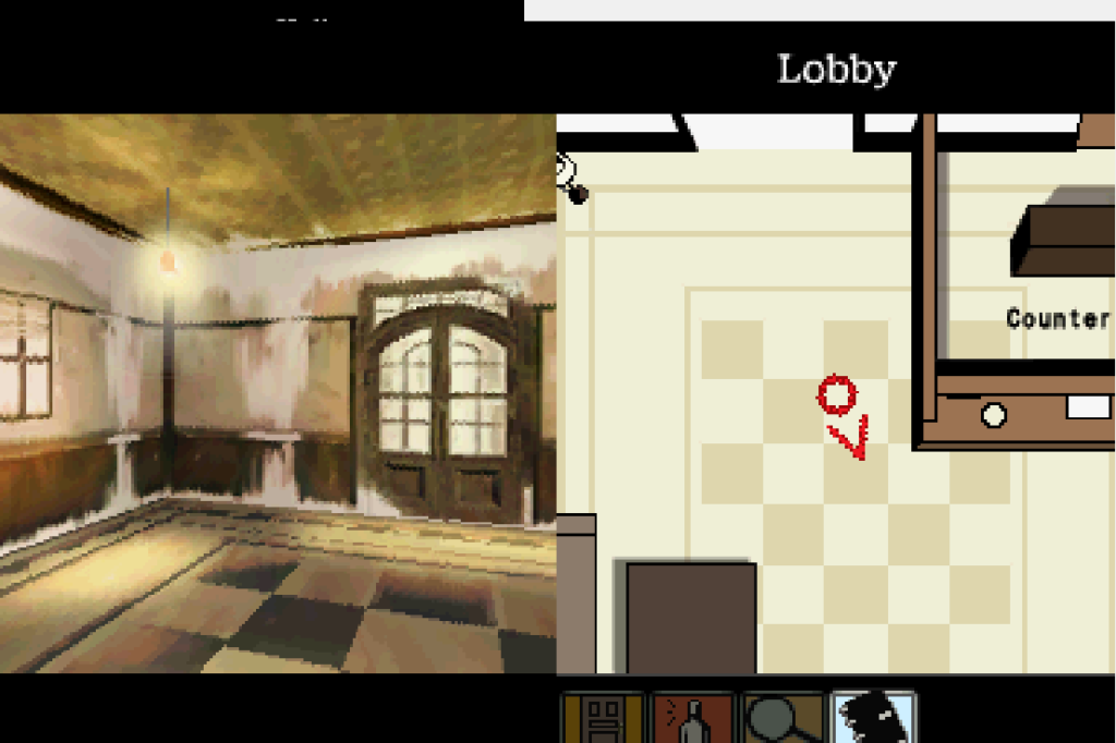 Le moment où l’on aperçoit de la 3D, en revanche, plonge sous une douche plutôt tiède. Certes, la Nintendo DS n’est pas réputée pour être ce qui se faisait de mieux dans le domaine, et surtout face à sa rivale la PSP bien plus puissante. Mais là, on sent déjà un manque de moyens évident. Bien sûr, ce n’est pas ce que l’on va chercher à regarder le plus et l’ambiance du motel sobre et un peu décrépi par endroits se ressent bien, et les pixels aussi. On a beau pouvoir effectuer quelques rotations de caméra lorsqu’on examine quelque chose, cela ne mettra clairement pas cet aspect du jeu à son honneur.
