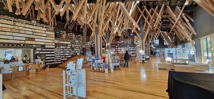 Plus récente que les structures présentées précédemment, la bibliothèque de Yusuhara semble être un condensé de la vision et du talent de Kuma. On retrouve de grandes vitres qui permettent à la lumière de pénétrer et aux visiteurs d’admirer le jardin extérieur, des panneaux de bois en façade et une hauteur modérée, pour communier avec la nature sans couvrir le paysage et la vue sur les montagnes voisines. À l’intérieur, le cèdre est partout, et des piliers de bois qui se superposent au plafond représentent la forêt et les rayons de lumière qui s’infiltrent à travers les arbres. Il s’en dégage une atmosphère apaisante, propice à la lecture et à la réflexion, où petits et grands peuvent se retrouver pour s’octroyer une pause rassérénante.