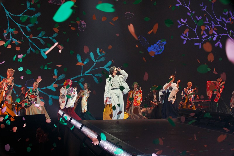 La scène se compose d’un écran qui prend toute la largeur où est diffusé des images : des clips ou bien le retour caméra de la salle. Des musiciens sont présents avec lui, il les présentera à la fin du concert. Il est aussi soutenu par des danseuses et danseurs durant le show. Ils changeront de costumes pour chaque titre où ils seront présents. Nous avons littéralement le même spectacle qu’au Japon pour cette tournée. C’est vraiment magnifique d’avoir ce genre de choses en France.