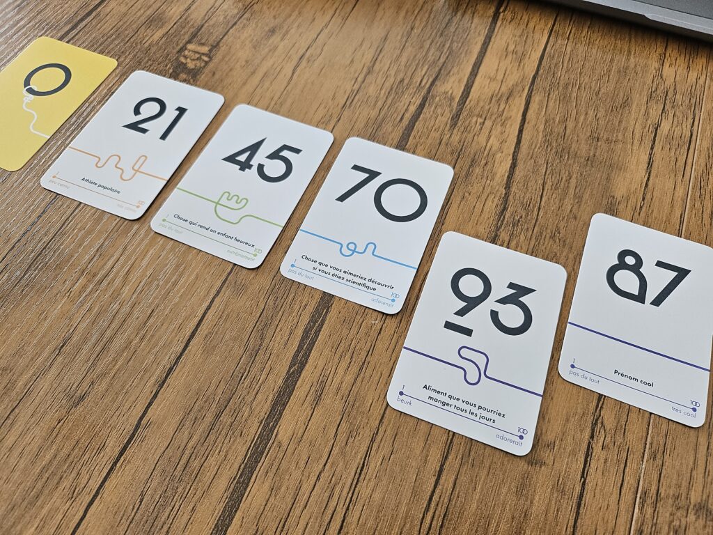 Si le jeu est trop simple pour votre équipe, vous pouvez corser les choses en prenant plus de cartes par joueur. Au plus il y a de cartes à placer correctement au centre de la table, au plus viser juste devient difficile. Le jeu prend fin lorsque vous le souhaitez : au bout de X manches, ou bien lorsque la pioche est terminée. Il n’y a pas de points à compter, le but du jeu est simplement de rigoler et débattre avec vos partenaires dont vous apprenez petit à petit à mieux comprendre les schémas de pensées !
