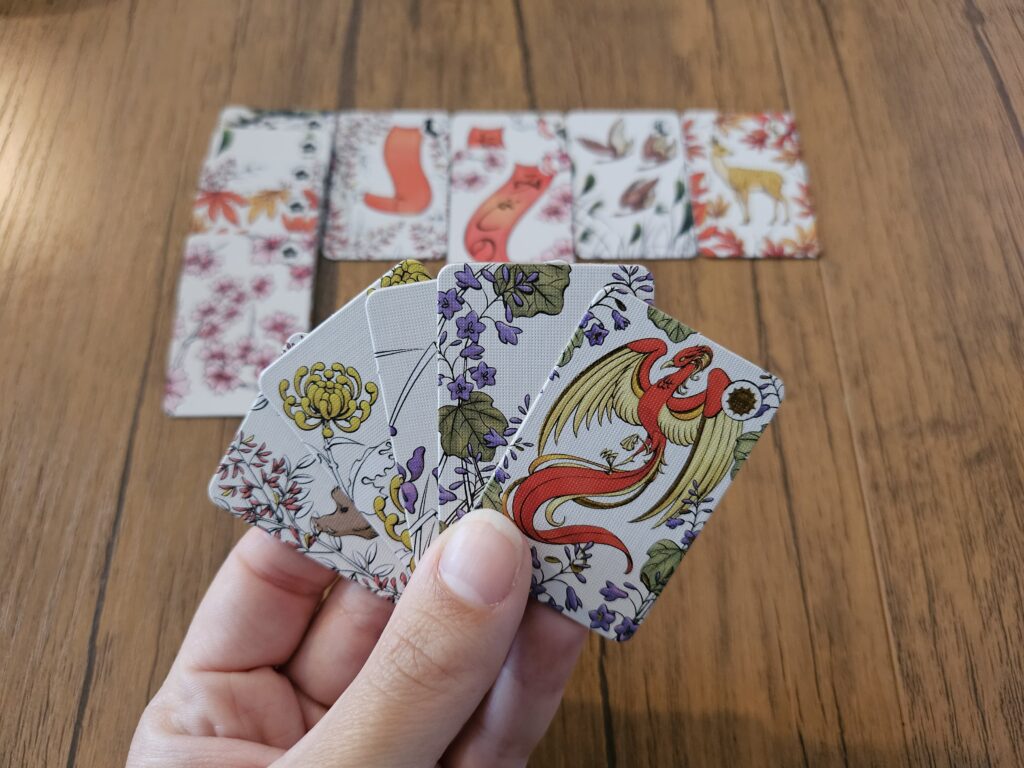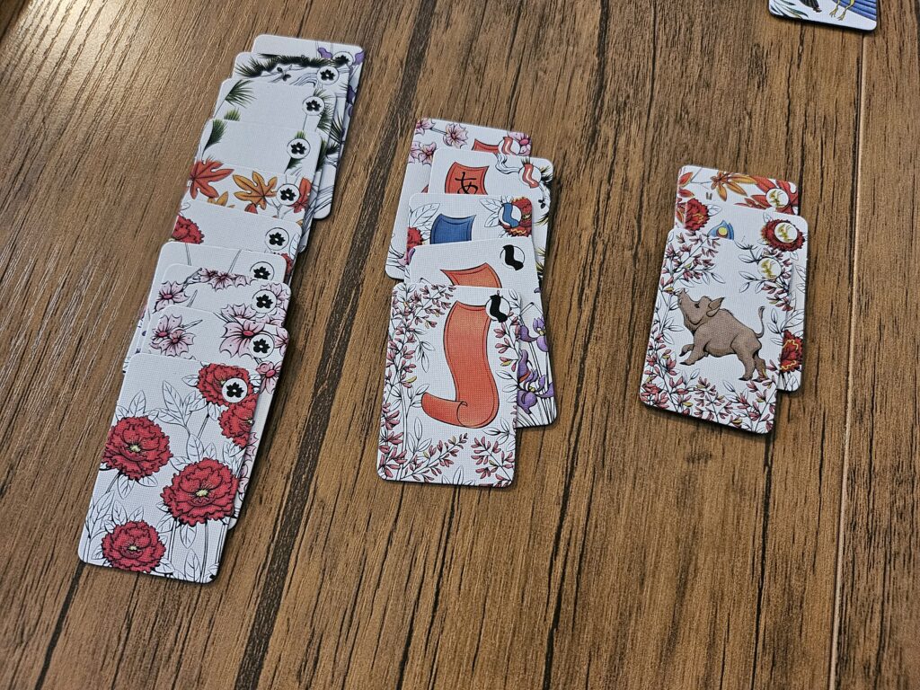 À son tour, le joueur réalise deux actions : utiliser une carte qu’il a en mains pour former une paire avec celle du Ba (s’il le peut), puis piocher une carte et récupérer la paire, s’il y en a une, ou laisser la carte piochée dans le Ba. Dès lors qu’il parvient à réaliser un yaku (par exemple : 10 fleurs, 5 animaux, ou bien 3 banderoles de couleur), il doit alors faire un choix : dire « shobu » et mettre fin à la manche, ou dire « koi » et continuer la manche. En disant « koi », le joueur multiplie par deux les points réalisés. Lors du deuxième yaku, il pourra dire « koi koi » pour tripler, puis « koi koi koi » pour quadrupler et ainsi de suite… Mais attention, les multiplicateurs sont communs aux deux joueurs ! Si le premier dit « koi », mais que c’est le second qui réalise un yaku après cette annonce, il peut alors dire « shobu » et mettre fin à la manche en profitant du x2 offert par l’adversaire. Les subtilités du décompte des points ne s’arrêtent pas là : à chaque manche, le gagnant marque autant de points que ses yaku lui permettent, et le vaincu perd ce même nombre de points !