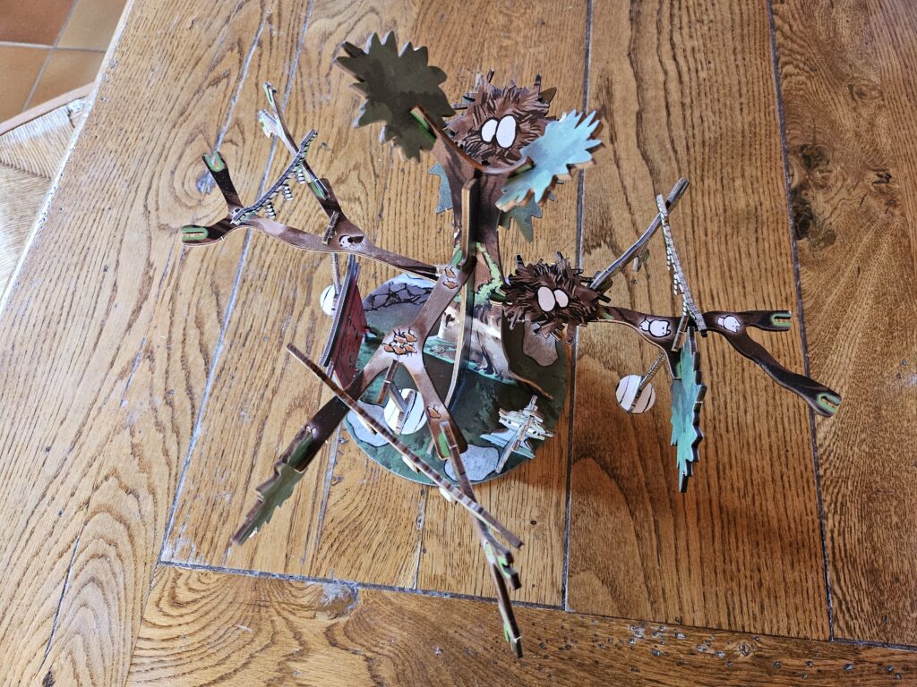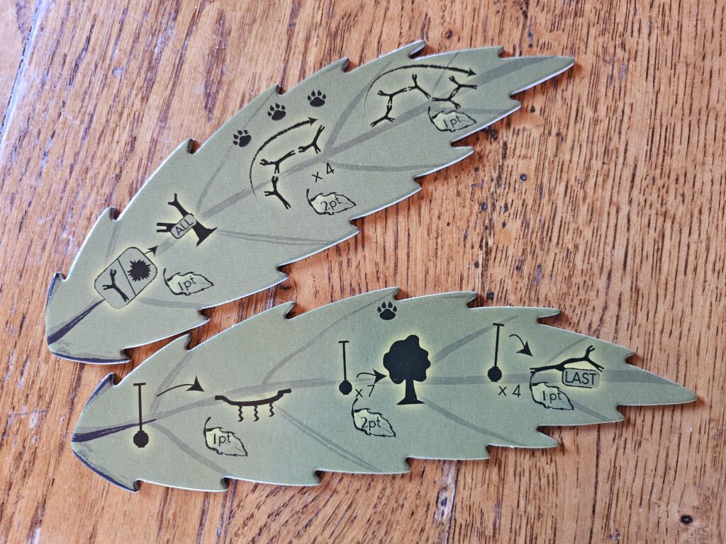 C’est en 5 manches (nommées « années » dans l’univers du jeu) que les joueurs doivent coopérer pour faire grandir cet arbre et le décorer. Mais cela ne se fait pas n’importe comment : les différents éléments ne peuvent être posés qu’à une seule main, et si ça tombe, c’est perdu ! Et des objectifs communs et personnels viennent challenger l’équipe. Le cumul des points possibles par l’ensemble des objectifs atteint 20, et au plus l’équipe se rapproche de ce score maximal, au plus la splendeur de son arbre est relevée. À 20, il devient un kami de la forêt, rien que ça !