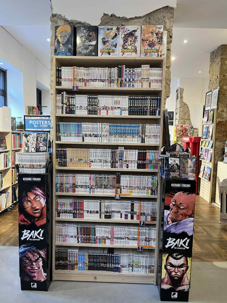 Depuis le début, Cyril est le seul actionnaire mais il est accompagné par un libraire qui y travaille à temps plein. La librairie est assez jeune mais commence à être connue. Elle est implantée dans une ville, Nice, où il n’y a pas assez de librairies par rapport au nombre d’habitants mais celles qui sont spécialisées en bande dessinée et généralistes sont là depuis longtemps et cela signifie qu’elle propose des nouveautés mais aussi des fonds que tout le monde a déjà. Cyril essaie donc d’y apporter ses goûts, ses envies de mettre en avant certains titres. Il vend aussi bien des mangas mais aussi des comics, des livres jeunesse, romans graphiques et propose des évènements autour du Japon que ce soit de la calligraphie ou des lectures. La librairie fait partie du réseau canal BD qui permet de mieux communiquer et proposer divers évènements comme la Japan Day qui a eu lieu le 15 mars, mais aussi de négocier avec des éditeurs de manga pour obtenir des jaquettes collector comme celle du tome 14 de Oshi no ko écrite par Aka Akasaka et dessinée par Mengo Yokoyari.